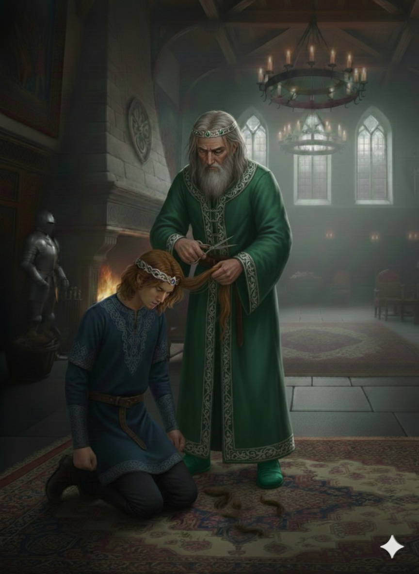 Один шаг, один подслушанный разговор — и юный князь Лауэран превращается из наследника великого рода в узника. В этой сцене нет криков, только лязг ножниц и холодный блеск глаз деда. Старый князь Фингар собственноручно срезает венец с головы того, кого еще вчера называл своей гордостью.