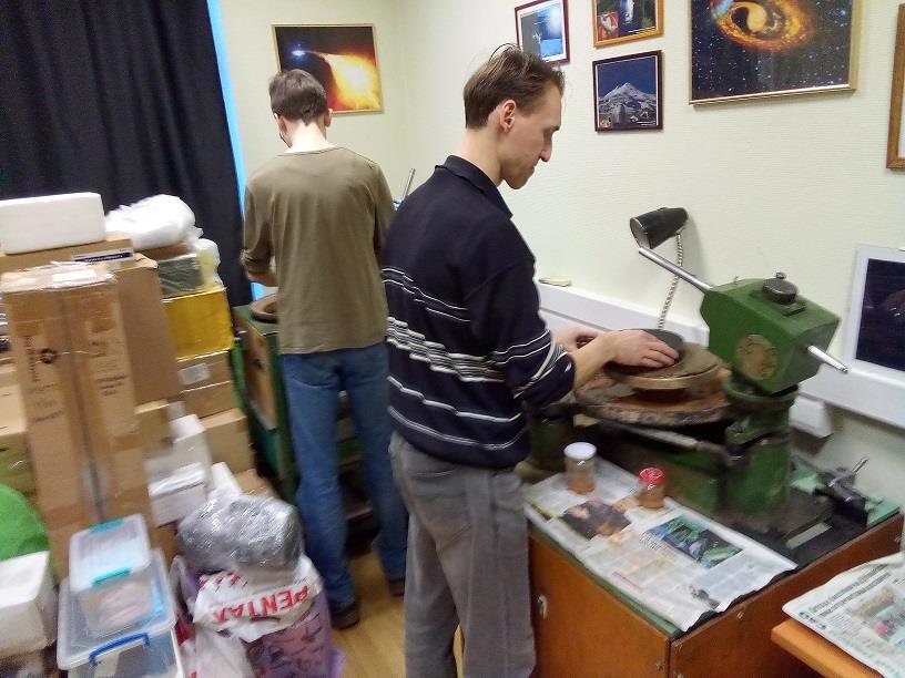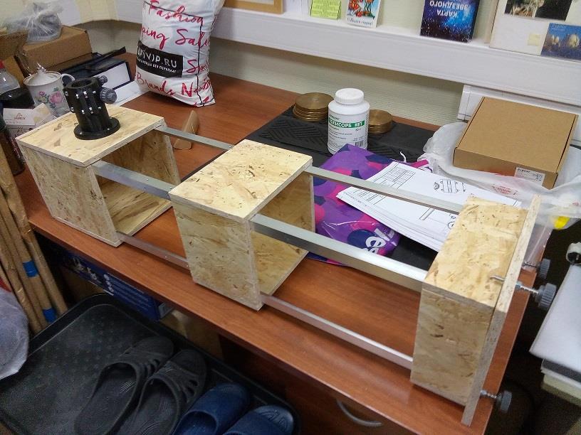 К 16 часам я закончил, и тут как раз приехал Кирилл, алчущий станка для доведения до ума своего сферического 130-мм зеркала. Он уже и трубу под него изготовил: