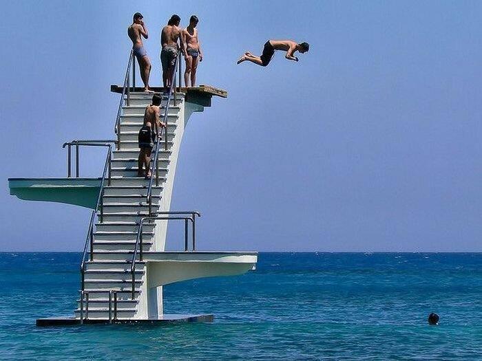 Видел как-то на море. Вышка, наверху молодой человек, он то подойдет, то отойдет от края. Все решает прыгать не прыгать. И, наконец, прыгает, но летит как-то непонятно. Ну и упал неудачно, все отбил себе.