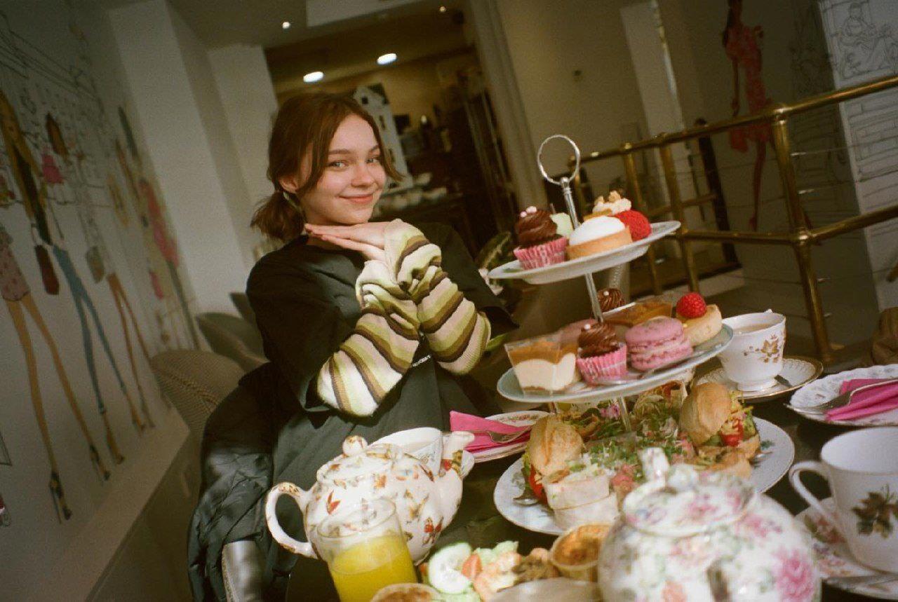 С тортиками довольная такая