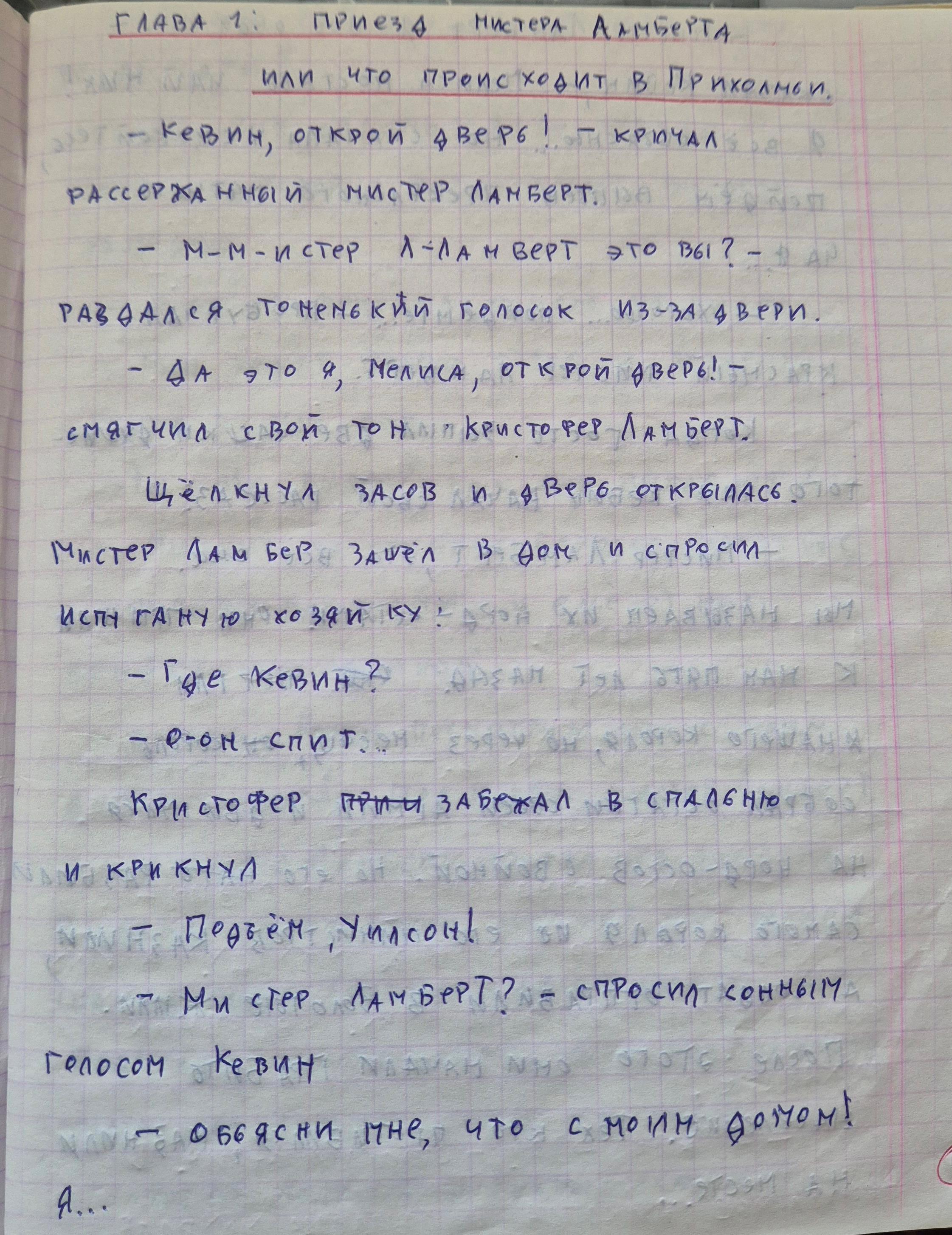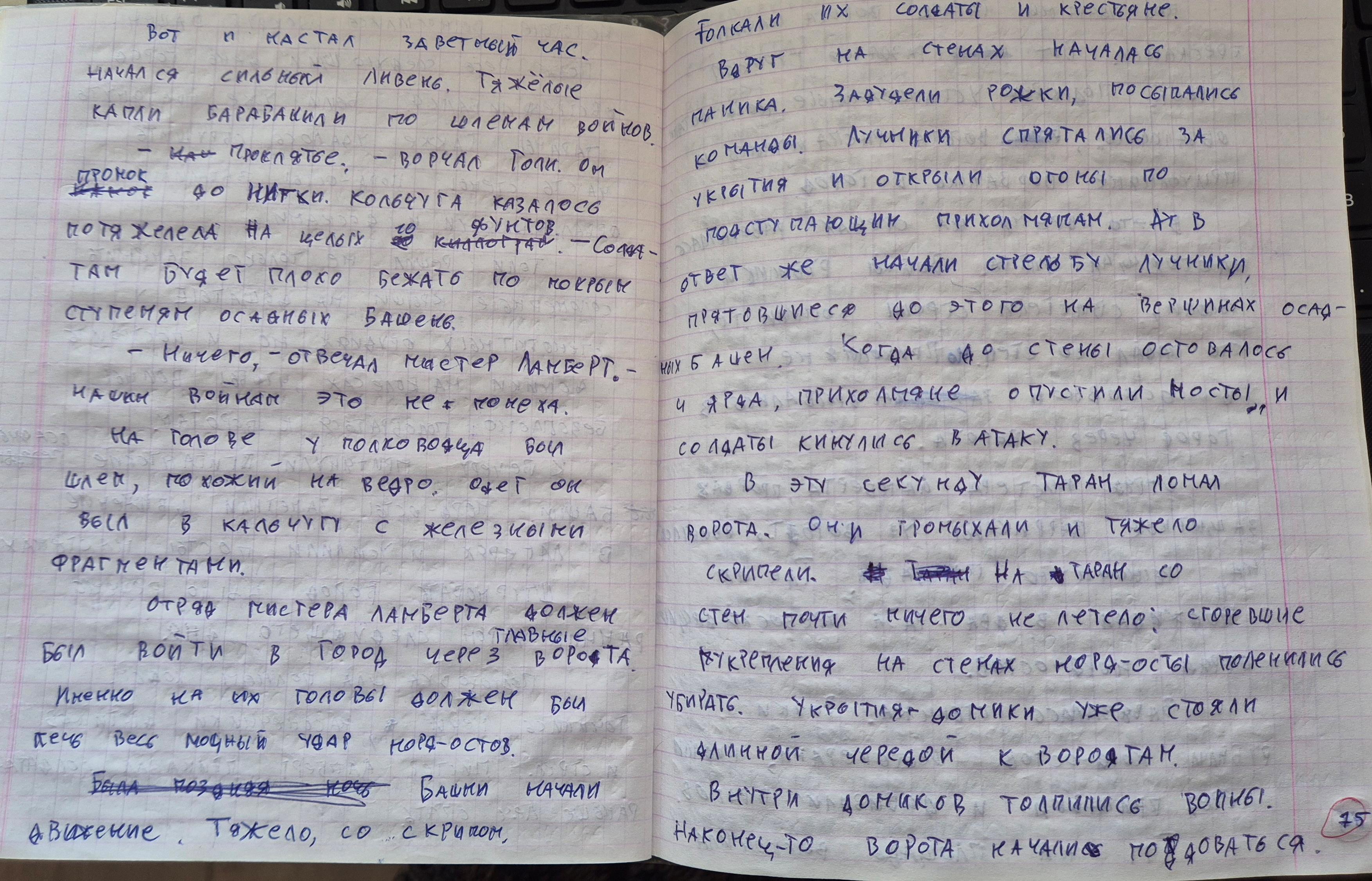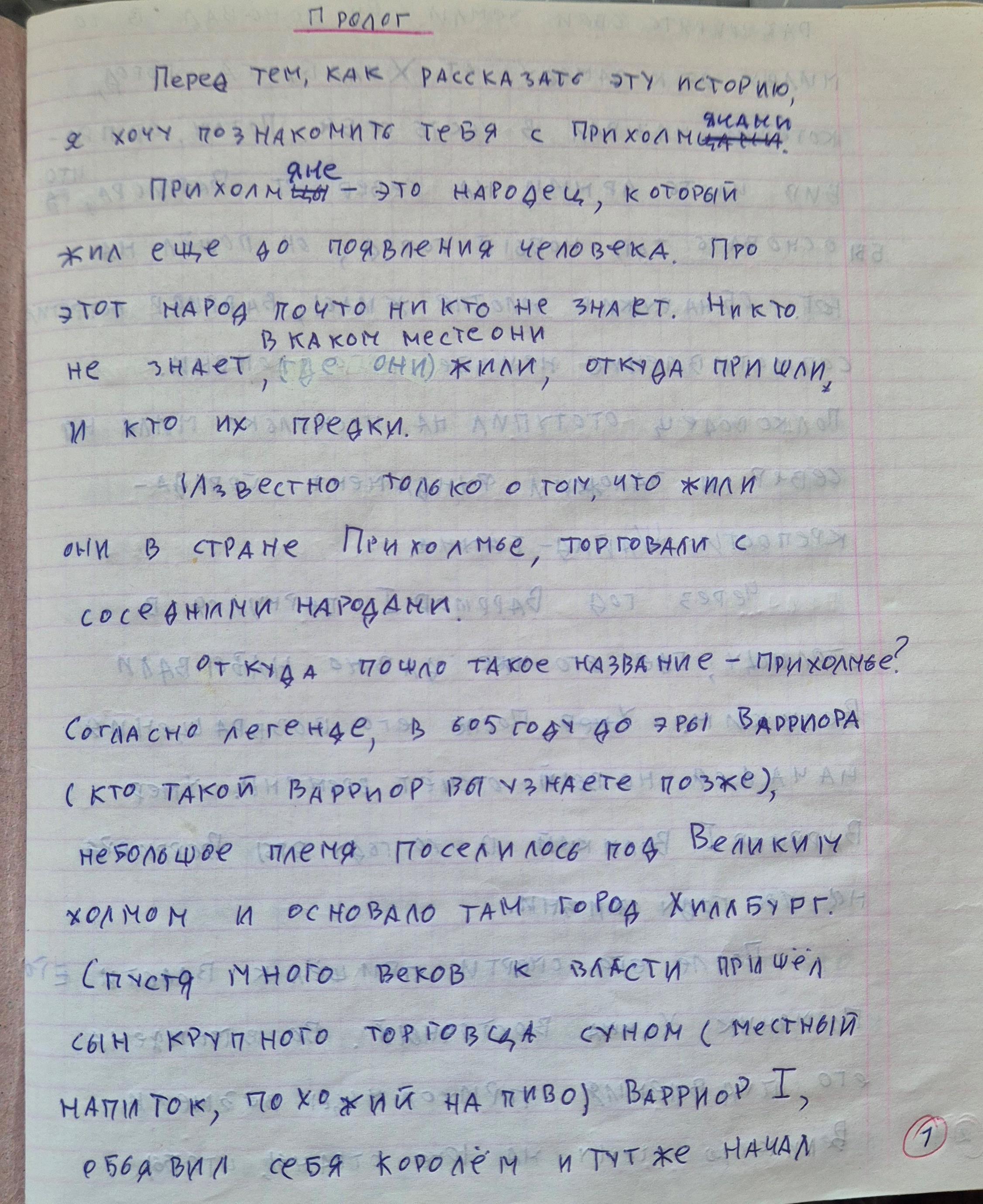 Итак, если верить моим электронным "архивам", то первый черновик "Возрождения" был создан в 2017 году (!). НО. До этого мной от руки корявым почерком было написано в полуобщую тетрадку другое произведение, у которого даже названия не было. Ниже я прикрепил фото того самого черновика. И лишь после того, как я начал переписывать эту работу на компьютер, я назвал произведение "Переполох в Прихолмье". Собственно, это название так и закрепиться за работой практически до самой финальной редакции "Возрождения".