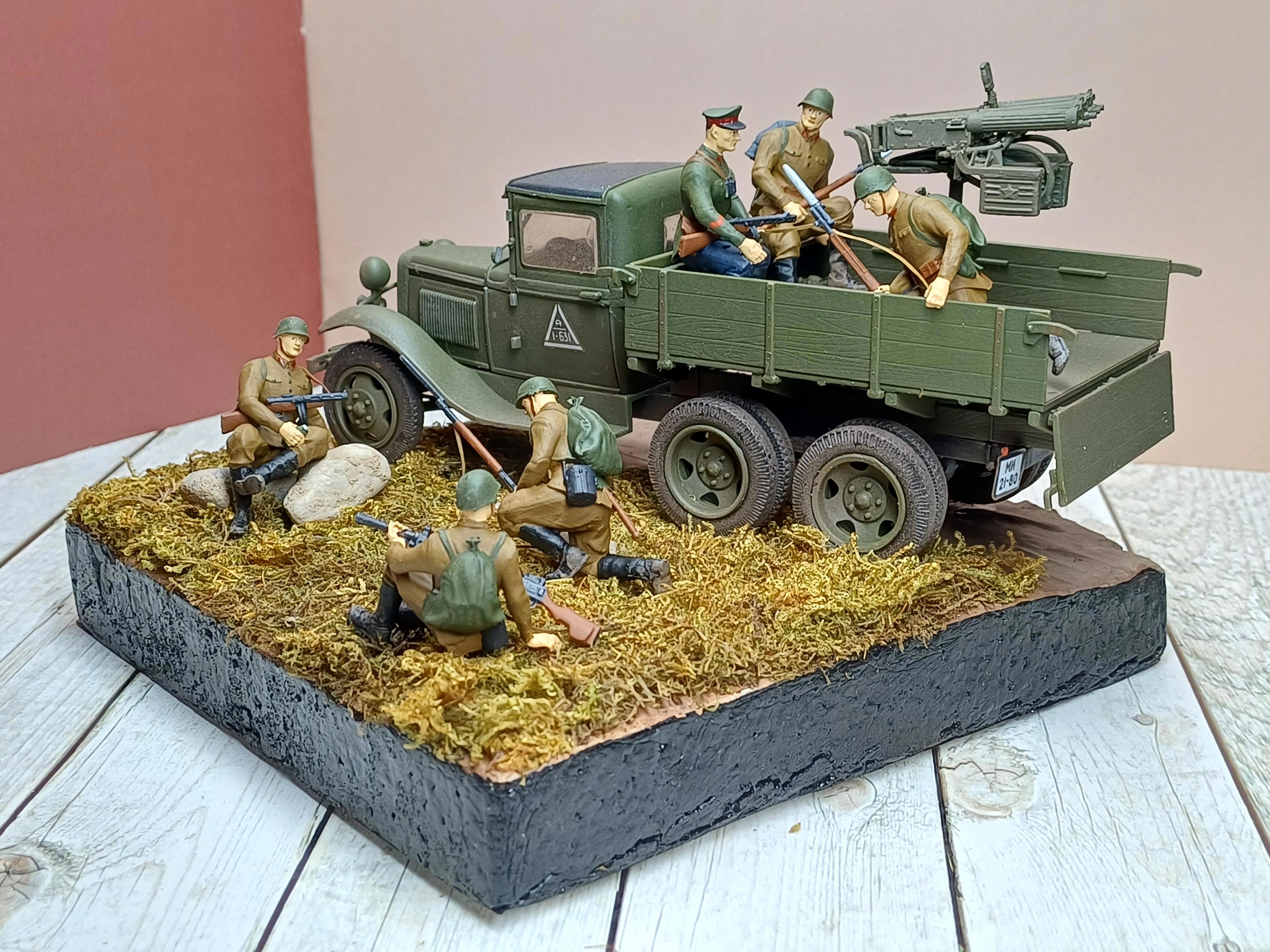 Вместо прогулок добил-таки гантрак. Правда, в качестве антуража посадил не обещанных раньше трёх танкистов, а набор пехоты. Набор халтурный - просто ух (это на совести производителя), так что знатоки периода могут поискать косяки. Пару видно прям сходу :)