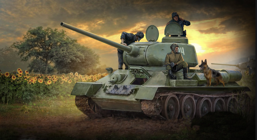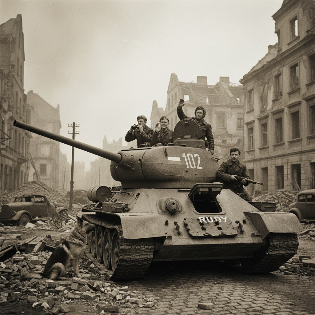 А это ИИ по запросу "Нарисуй изображение. Фон - разрушенный город в 40-е годы прошлого века. На переднем плане Танк Т-34-85 из сериала "4 танкиста и собака" с экипажем: Ольгерд Ярош, Ян Кос, Густав Елень, Григорий Саакашвили и пёс-овчарка Шарик"... В целом, если заморочиться и доработать - ничего так будет
