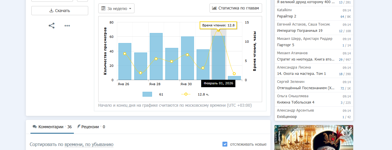 Вчера общее время чтения моего произведения впервые перевалило за десяточку! Большое спасибо за то, что читаете. Для меня это очень важно и очень мотивирует творить дальше!