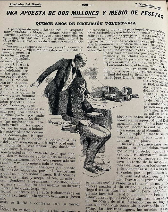 Листая испанский журнал «Alrededor del mundo» от 7 ноября 1901 года, я обнаружил там историю, почти дословно повторяющую чеховский сюжет. Почти в точности. Но имя Чехова не упоминается вовсе. Автор не указан. А читателю всё подаётся как реальный случай, якобы произошедший в Москве. Более того, указаны точные даты: с августа 1886 года по 10 августа 1901-го. У Чехова - другие: с 14 ноября 1870 по 14 ноября 1885. В испанской версии появляются имена, которых у Чехова не было. Банкира зовут Коломенское - именно так, в среднем роде :). Юриста - Иван Уланский.