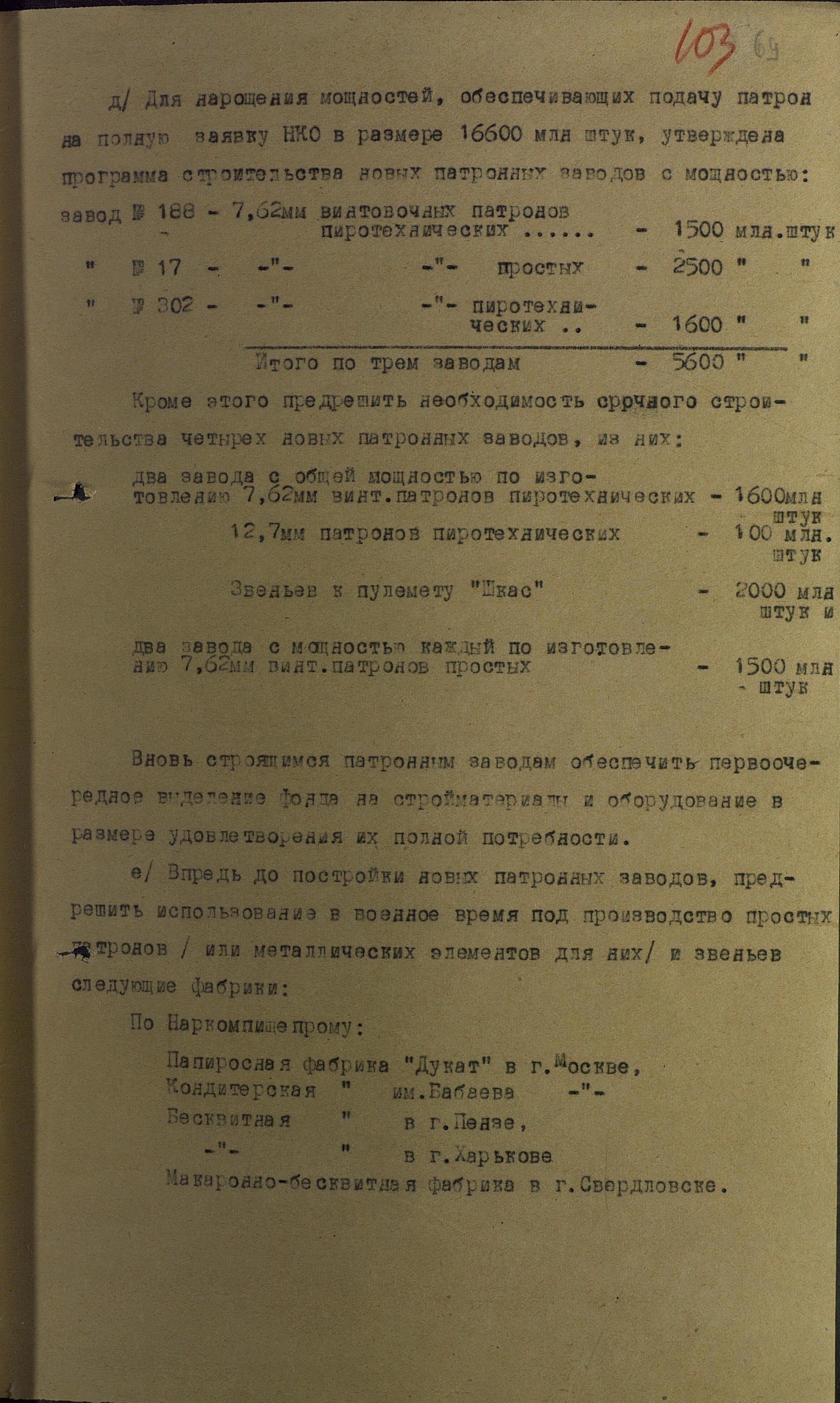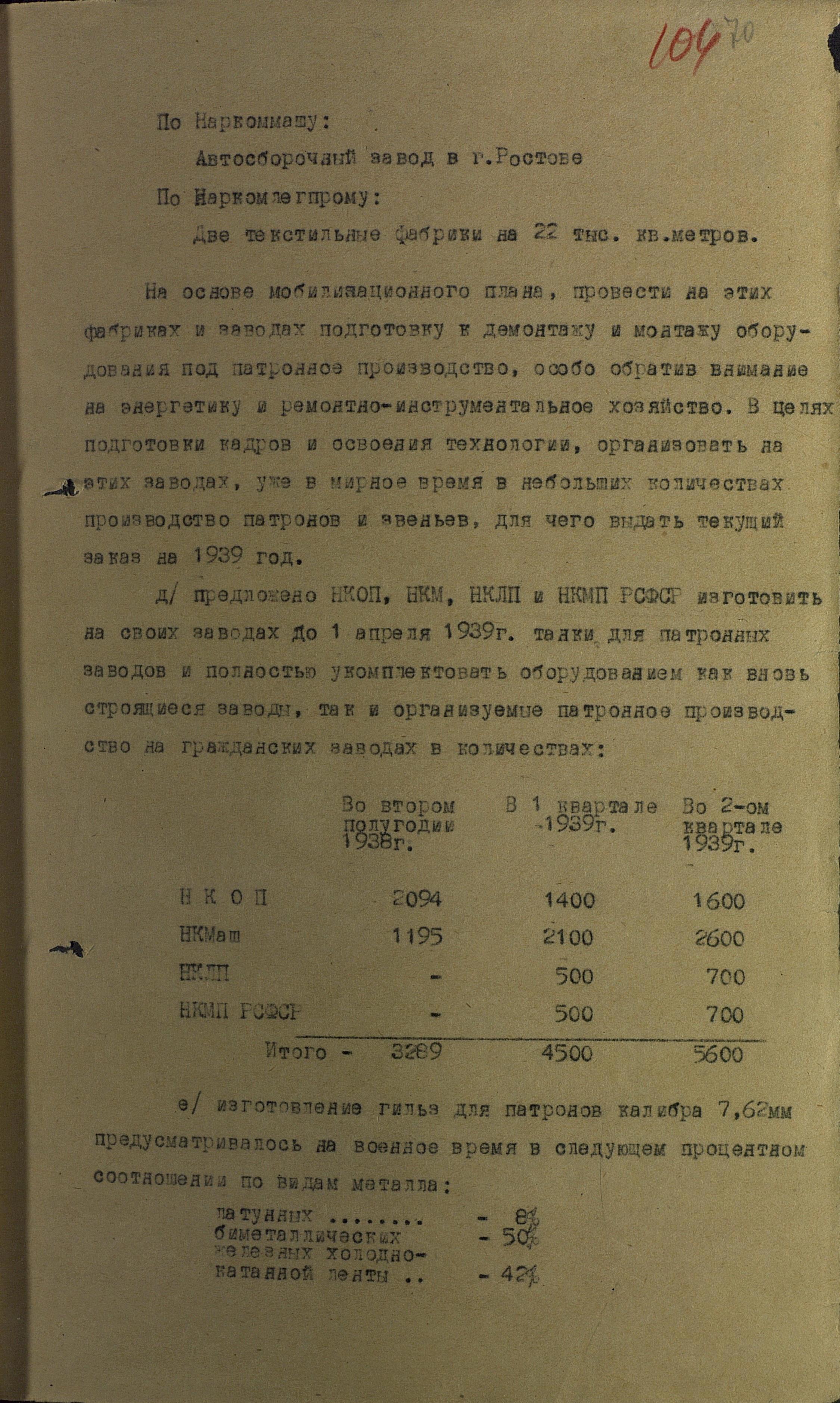 На основе мобилизационного плана, провести на этих фабриках и заводах подготовку к демонтажу и монтажу оборудования под патронное производство, особо обратив внимание на энергетику и ремонтно-инструментальное хозяйство. В целях подготовки кадров и освоения технологии, организовать на этих заводах, уже в мирное время в небольших количествах, производство патронов и звеньев, для чего выдать текущий заказ на 1939 год.