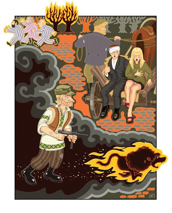 Автор: Майк Галь"Дядя Юра ожесточенно матерился, изо всех сил натягивая вожжи, чтобы удержать лошадь, рвущуюся куда-то вбок, а слева по тротуару, испуская нечеловеческие и в то же время совсем человеческие, полные боли и ужаса визги, неслось что-то горящее, какой-то комок пламени, оставляя за собой брызги огня, и прежде, чем Андрей успел опомниться, понять, Стась ловко соскочил с телеги и от живота, в две коротких очереди срезал из автомата этот живой факел — только стекла зазвенели в какой-то витрине. Огненный комок, кувыркаясь, прокатился по тротуару, жалобно пискнул в последний раз и замер. — Отмучился, бедняга, — сказал Стась хрипло, и Андрей наконец понял, что это был павиан, горящий павиан." Стругацкие, Град обреченный.