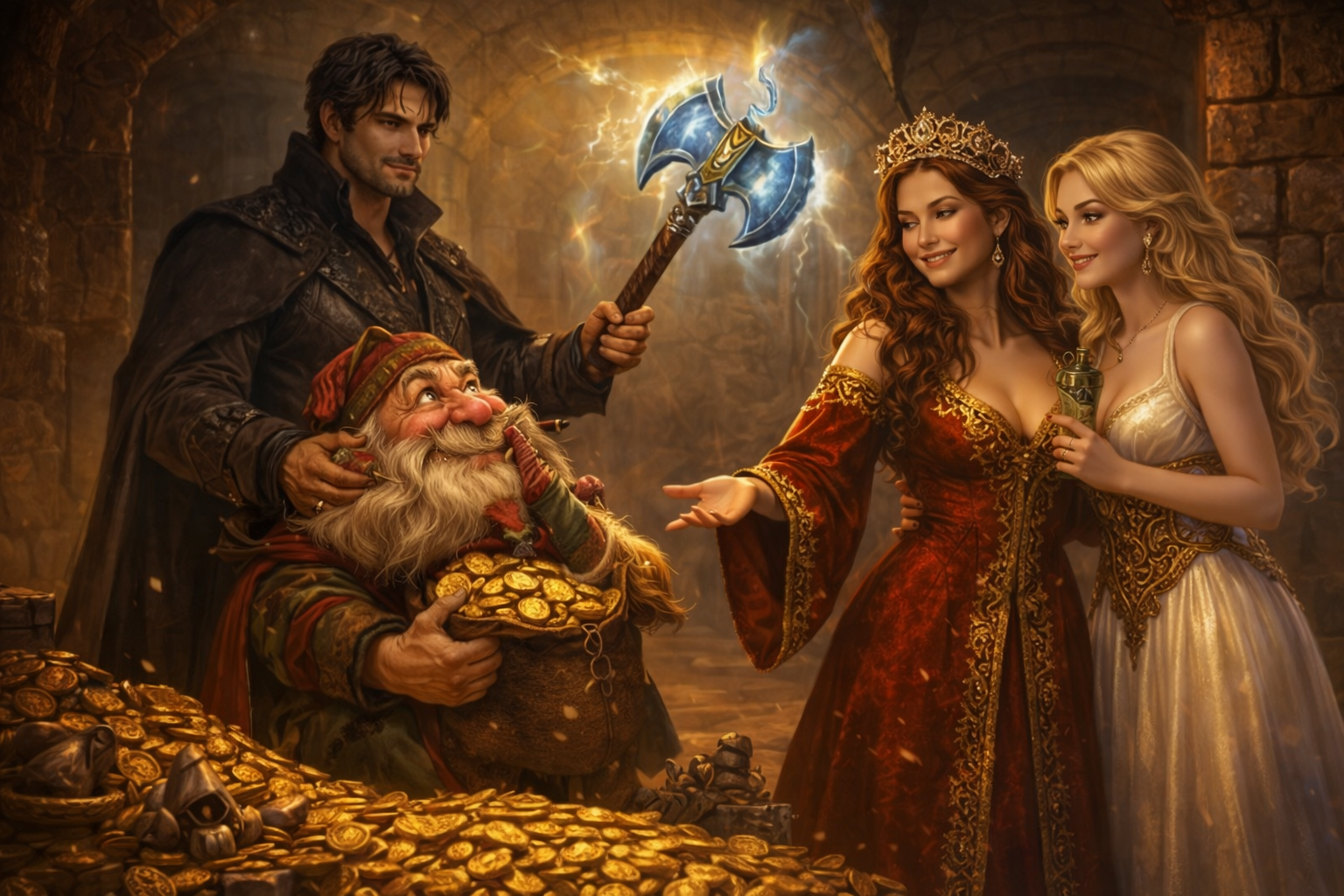 Гном посмотрел на топор, на девицу, на мешок золота.