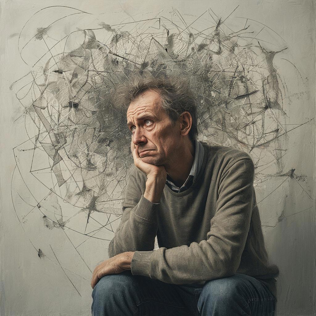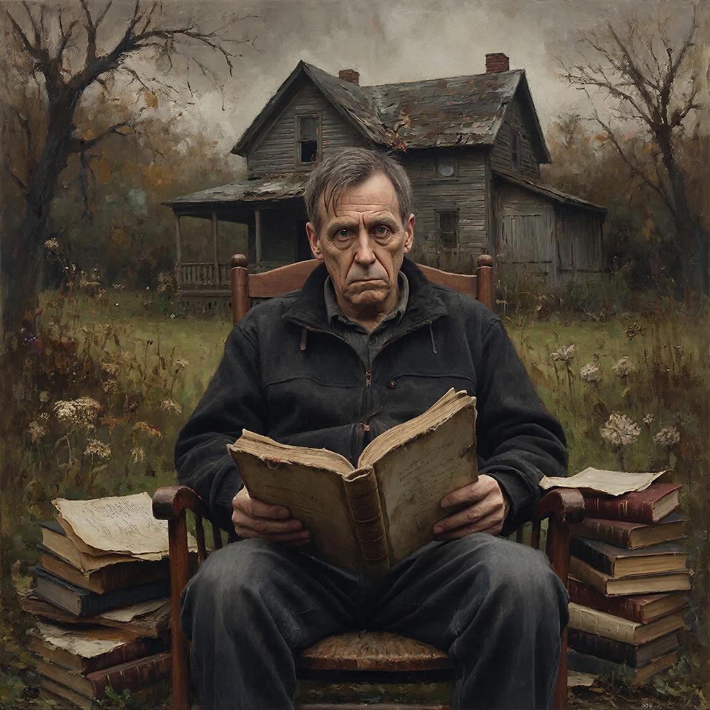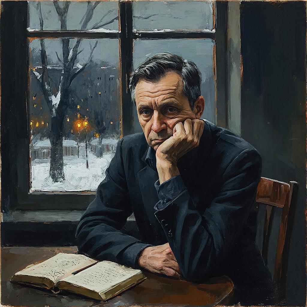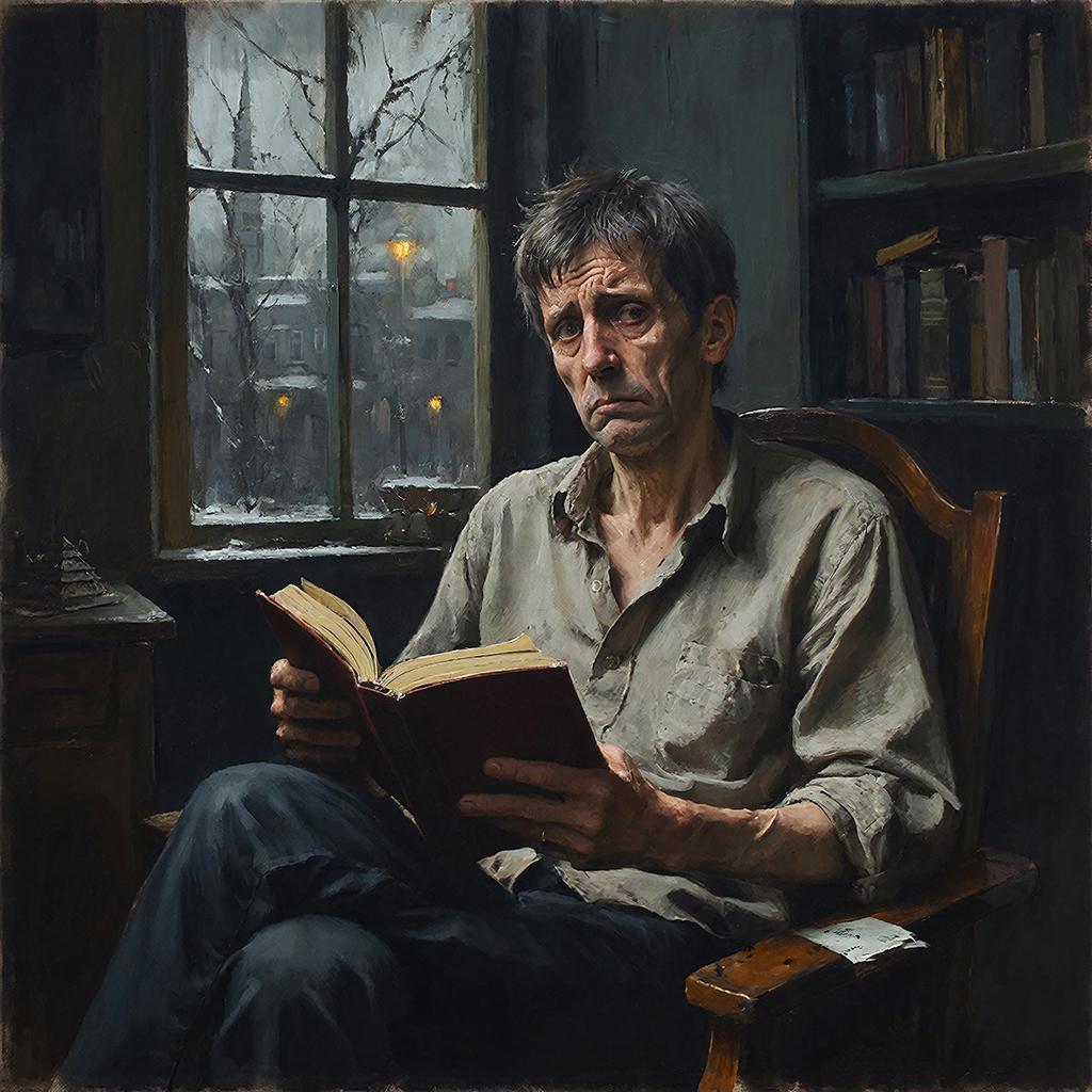 Люблю скармливать нейросети то, что вроде как не предназначено для рисования, как этот отрывок. Цезура Гигачата отторгает слово "дурак" — пришлось заменить на "глупый" — обхохочешься. Ещё иронично, что чем больше машина силится изобразить умного человека, тем более грустное и измождённое у него лицо.
