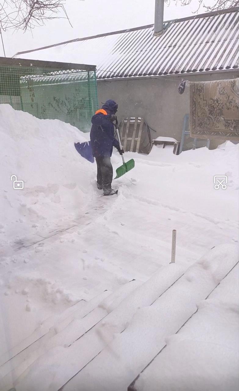 Он же и развлекался с лопатой весь свой выходной, разгребая снег во дворе, который упрямо не хотел заканчиваться, сыпал и сыпал. Почти ло крыши беседки теперь сугроб стоит! Хорошо мужу, не замерз в своей мчс-ной одежде и обуви!Только брови в снегу, как у Деда Мороза.