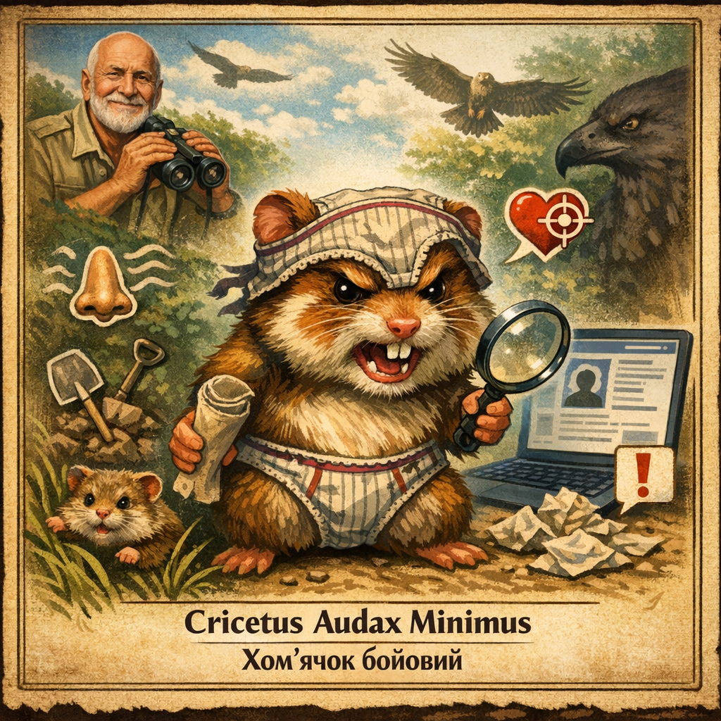 В бескрайних просторах интернета обитает удивительное создание — Cricetus Audax Minimus, или хом’ячок бойовий. Это робкое, но чрезвычайно преданное существо редко показывается в открытой местности, предпочитая прятаться в тени более крупных и заметных особей.