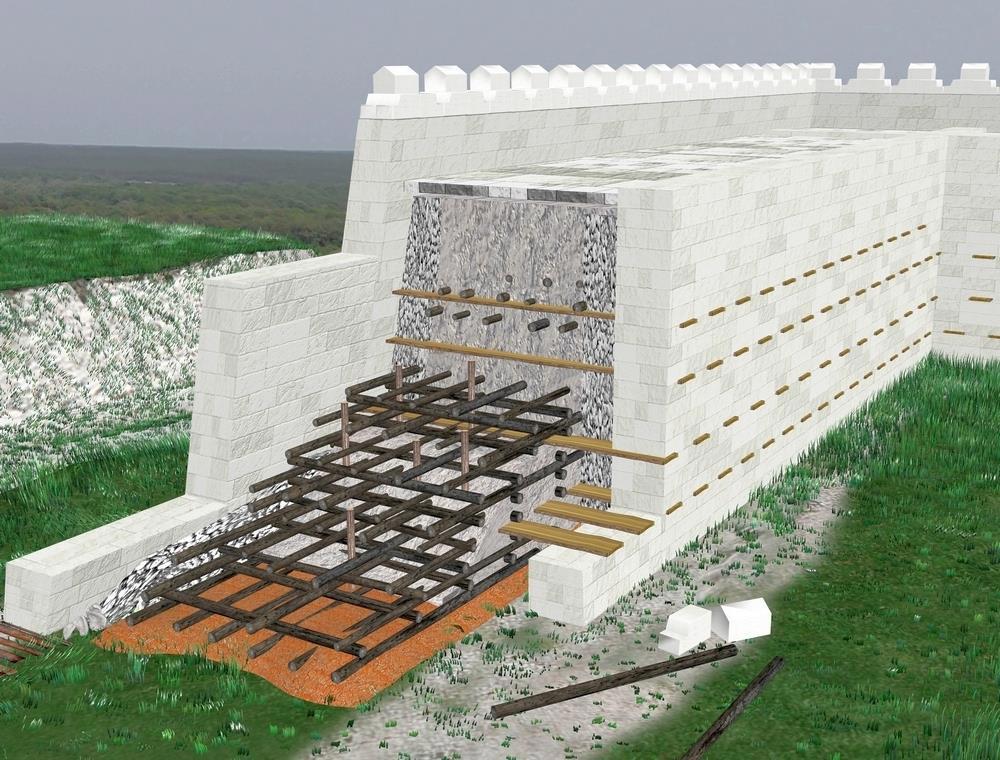 Обзор по горизонту очень хороший и его ничего не закрывает. Ни одной возвышенности. Даже странно, почему ни у кого не возникло простого вопроса – а откуда он здесь вообще появился? Может его насыпали? Что – много работы? Ну так для возведения Змиевых валов труда затрачено было ещё больше… незнамо кем и незнамо когда. Да и крепость эта тоже состояла не только из каменных стен. Вот современная реконструкция её стен: