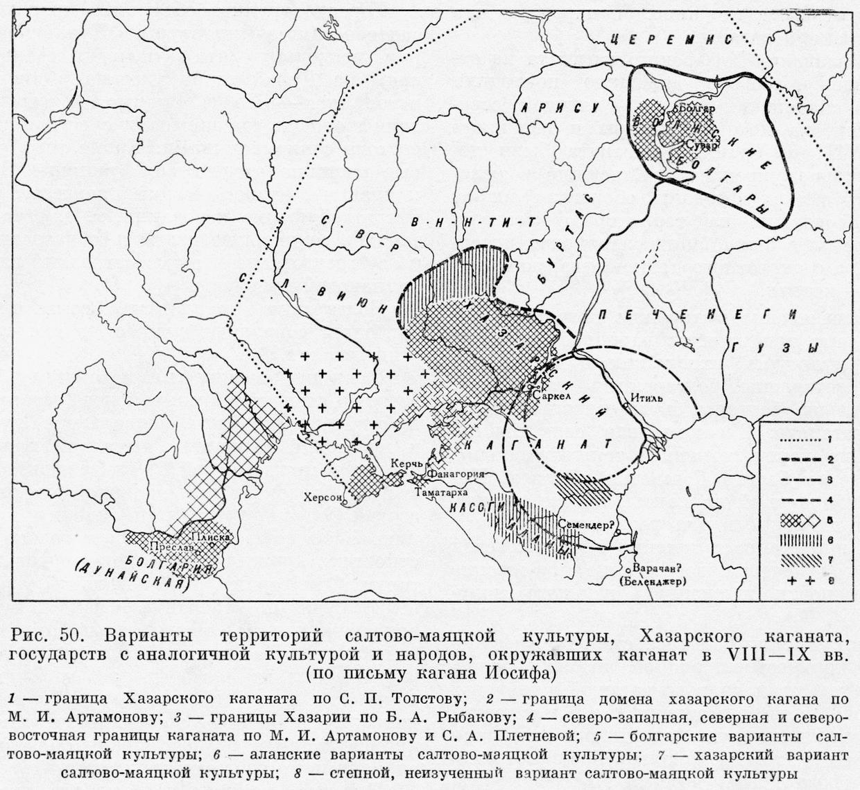 Наверное, чуть не больше всех в хитросплетениях салтово-маяцкой культуры поработала С.А. Плетнёва. Именно под её руководством проходили раскопки комплекса Маяцкой крепости. Её интерпретация добротно насыщена картинками керамики, картами распространения изделий, сходных с изделиями из раскопок салтово-маяцкой культуры. Рассказывая о результатах своих исследований, она сумела написать прямо-таки эпическое полотно, охватывающее пространство от южных отрогов Кавказа до среднего течения Дона и от Дельты до Болгарии. Получилось не только очень научно, но и достаточно живо. Прямо-таки видишь, как арабы под знаменем Пророка на своих коняжках, лихо сметая страны и народы, переваливают Кавказские горы и под их натиском начинает происходить… что-то очень невнятное. Оседлые аланы вперемешку с «тюркоязычными кочевниками» болгарами, невнятные кавказские многочисленные племена и всякие прочие откатываются под напором арабской конницы аж до среднего течения Дона, строя по пути крепости типа Маяцкой и суетливо изготавливая горы керамики. Вавилонское столпотворение под чутким руководством хазар, короче.