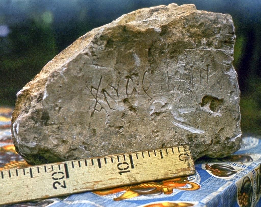 Надписи! Ну, конечно же – есть же надписи на камнях. Щас вот прочитаем их и успешно докажем главное, что они – не русские, а исходя из этого докажем, что и город построили любые, но не русские. Русские ведь были совсем дикими, а поэтому никак не могли ничего написать, тем более что их не было вообще. А если и писали, то писали «чертами и резами». Вы знаете, что такое «черты с резами»? Вот! И я не знаю, поэтому надписи сделаны не ими. Надписи ведь сделаны рунами, а руны это… вот у кого какие есть версии, что такое руны? Кто их мог написать? Да, кто угодно из нерусских! Вот, например, камень с надписью: