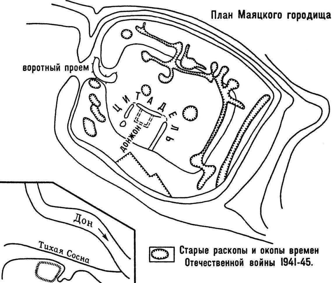 Доказательства? Есть у Плетнёвой и они. Вот такая карта раскопа «хутора гончаров» при Маяцкой крепости, например:
