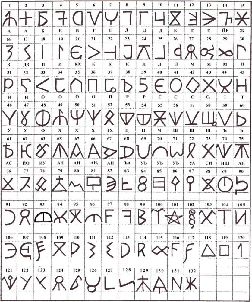 Я, правда, так и не понял, какое отношение имеют аланы к булгарам, но бог с ними. Просветители от науки расслабиться и подумать не дают – так и сыплют строго научной и вовсю достоверной информацией. Видимо убоявшись, что двух вариантов маловато будет, показывают ещё образец под названием «северские руны»: