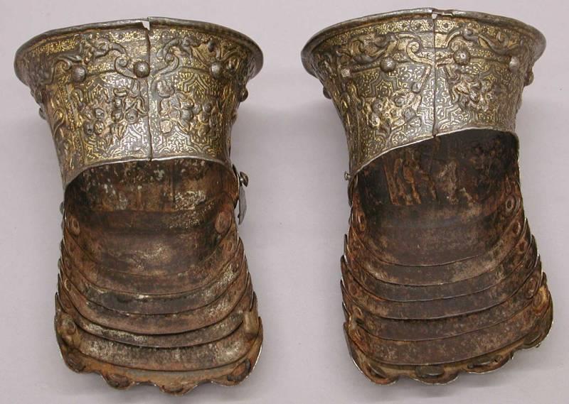 Детские латные рукавицы, принадлежащие к доспехам, подаренным испанским губернатором Милана будущему королю Филиппу III Испанскому (1578–1621, правил с 1598). Оружейник: Лучио Пиччинино (итальянец, Милан, работал ок. 1575–1590 гг.) Изготовлены около 1585 г. Материал: сталь, золото, серебро. Размеры: длина каждой 18,1 см; Вес каждой 226,8 г. Метрополитен-музей, Нью-Йорк
