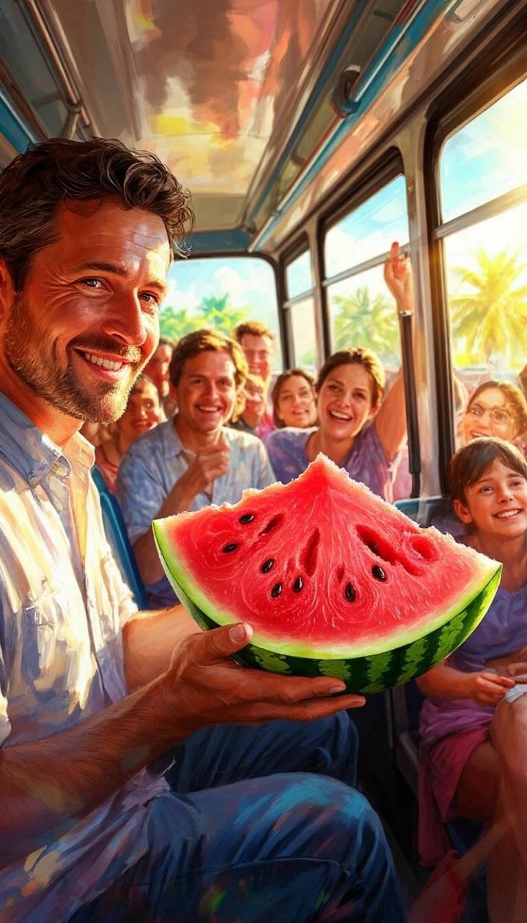 Внезапно в окна автобуса хлынуло умытое дождем солнце. Атмосфера вокруг стала почти семейной, домашней. Словно вместе с кусочками арбуза этот мужчина раздал каждому по маленькой части радости. А хватило всем с избытком.