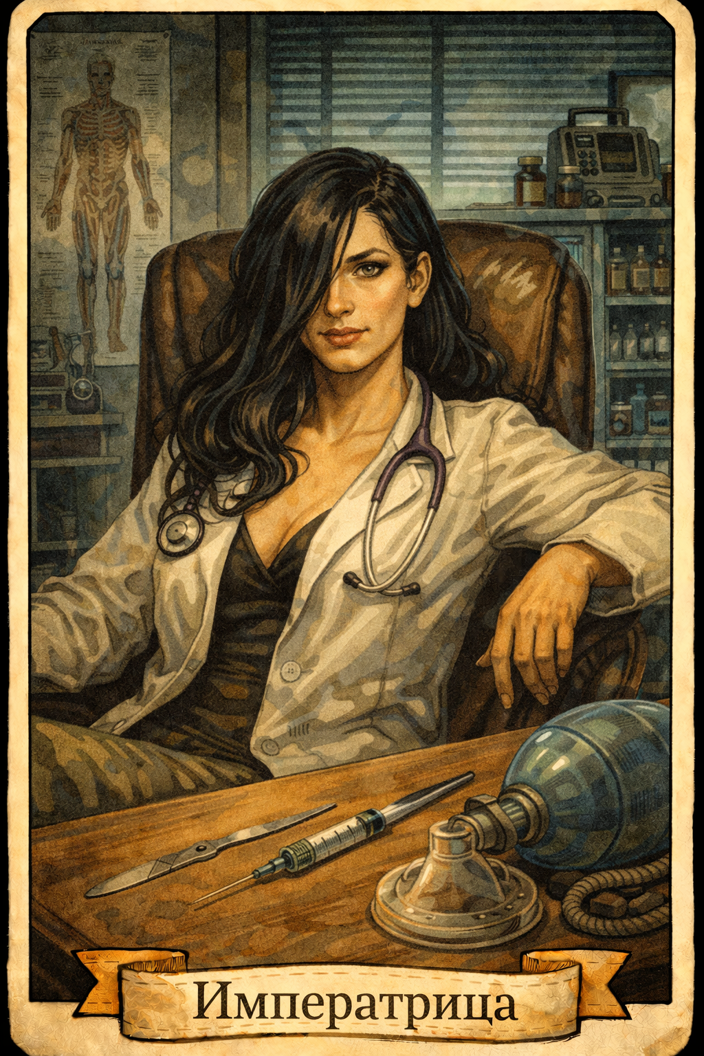 Императрица, конечно же, донна Изабель. Если в классической колоде это символ жизни, плодородия и торжества над мертвым, то в рамках нашего канона не найти никого, кто смог бы отвоевать у смерти столько жизней, как главврач больницы республики Сент-Пи.