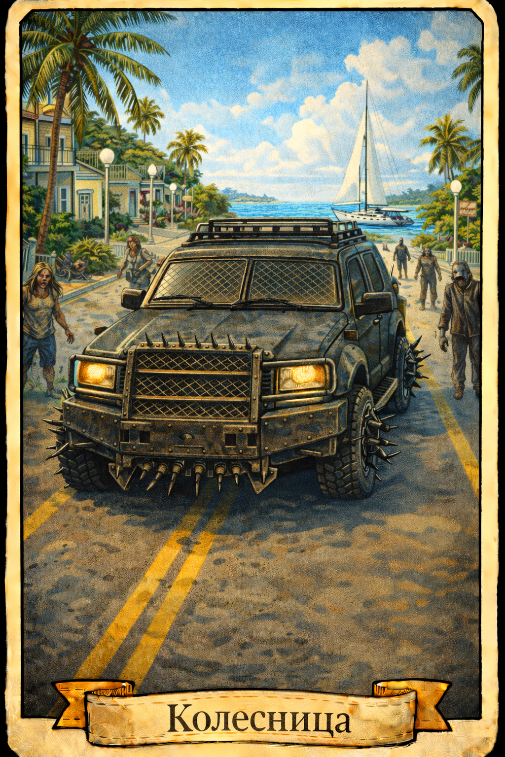 Колесница ЗА - на суше и на море. Есть у нас в работе и телеги, запряженные мертвяками, но Колесница всегда про скорость, а не медленное трюханье под зомбячье амбре и хрипы.
