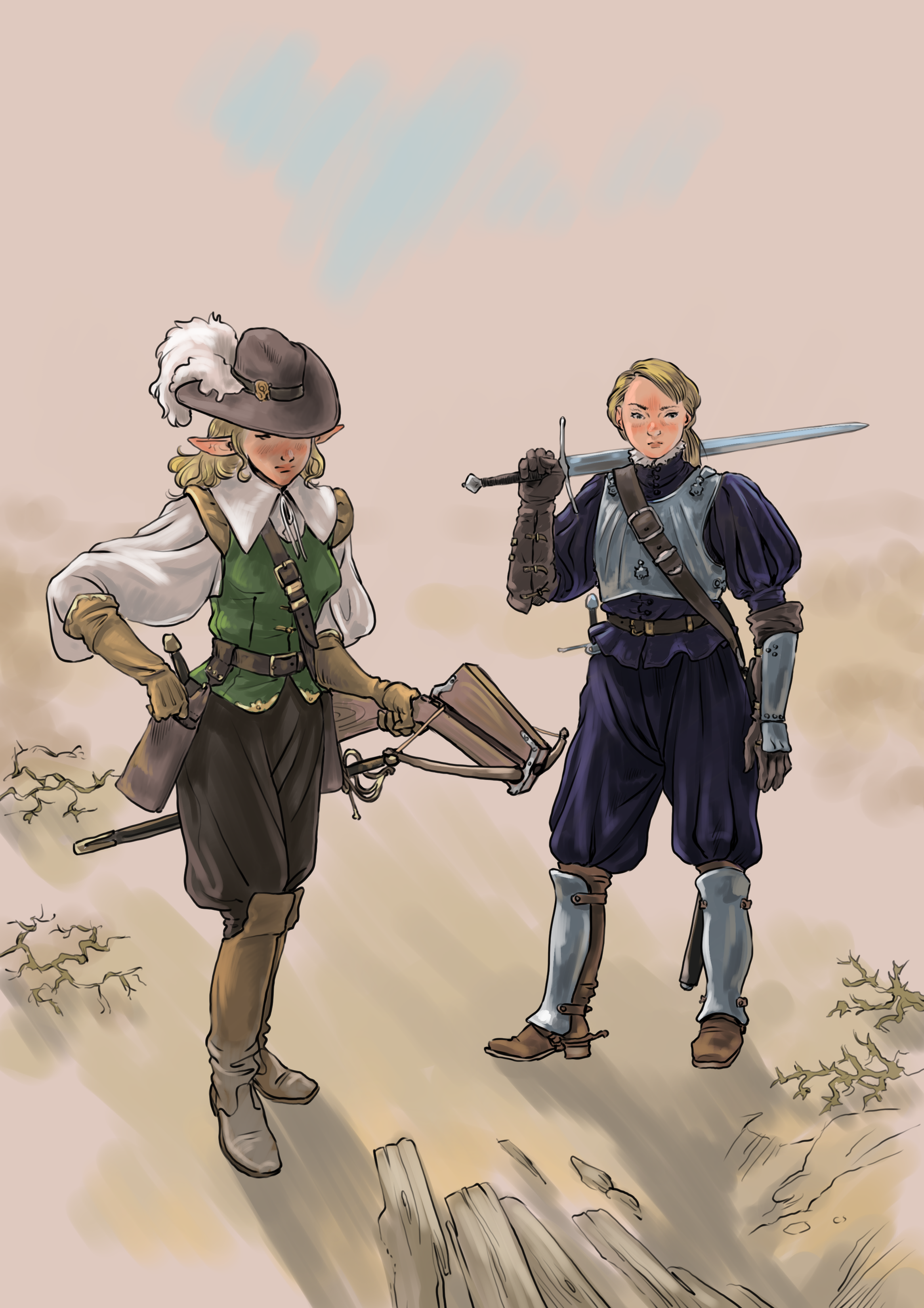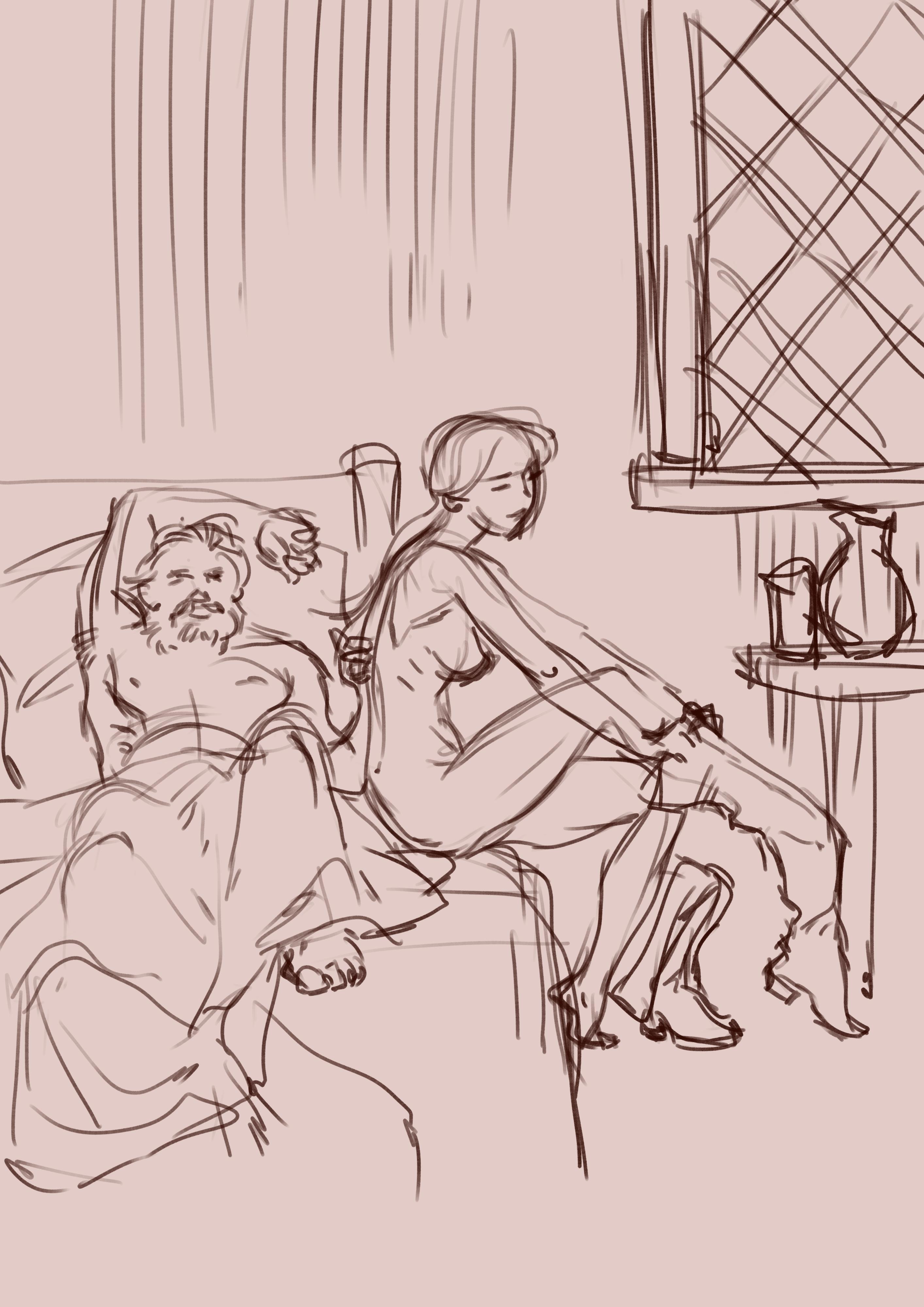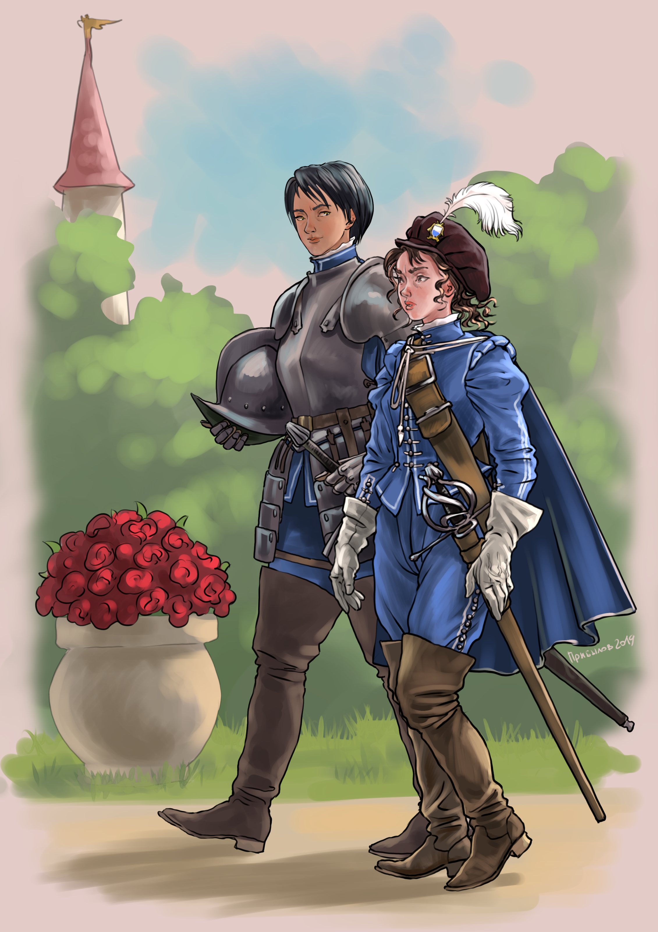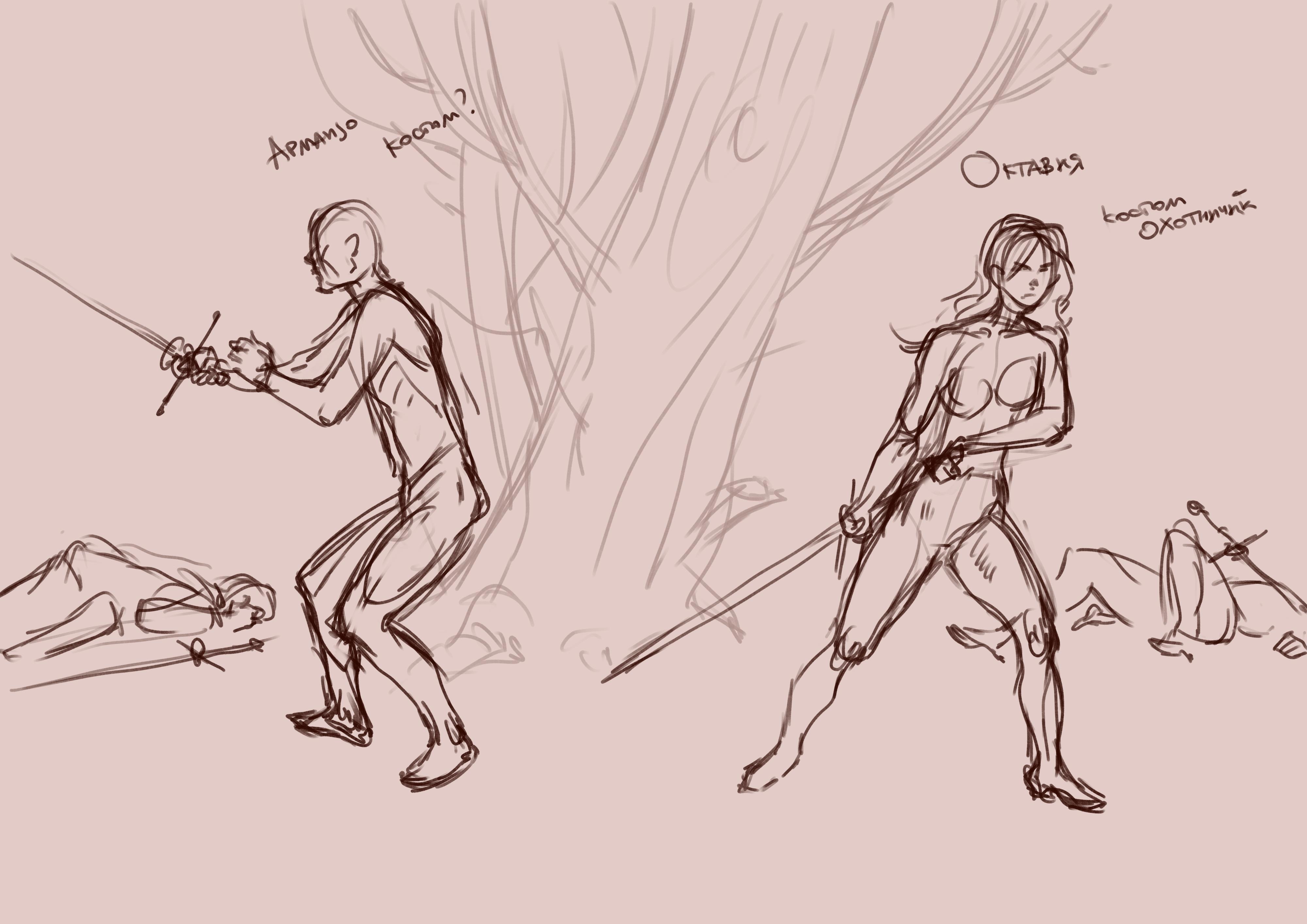 Позже надеюсь добавить еще одну иллюстрацию (боевую сцену). Во всяком случае, скетч на нее есть: