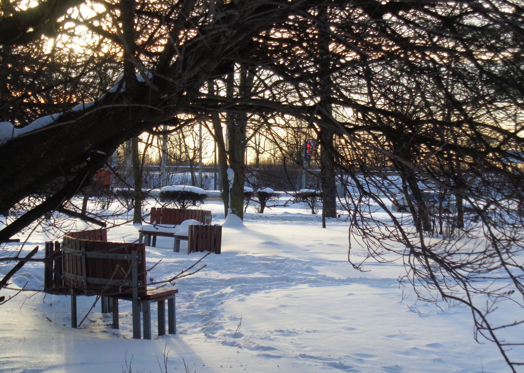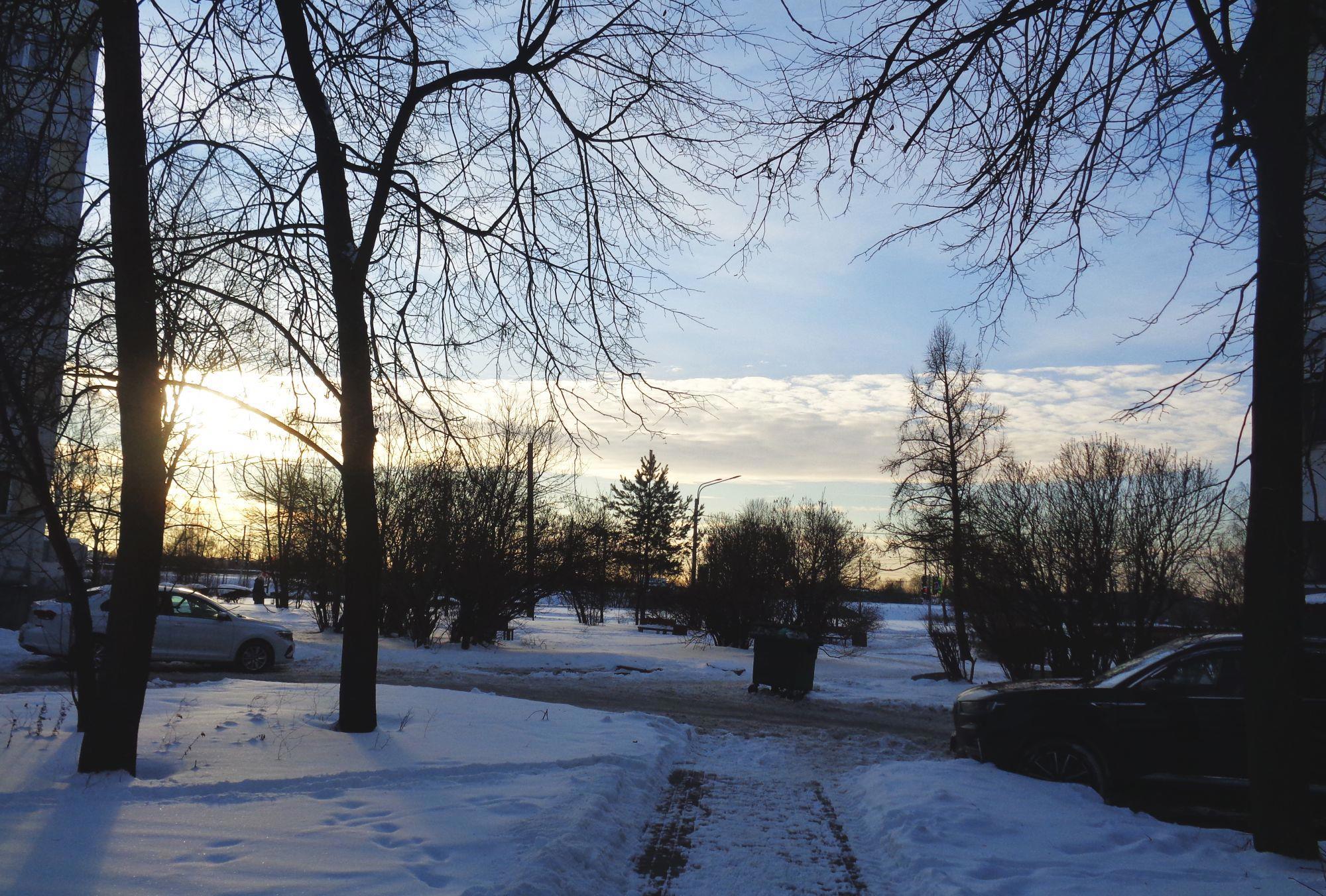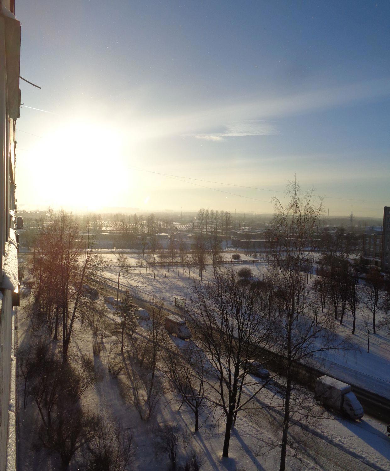 Зима, снег, закат, город и тому подобное