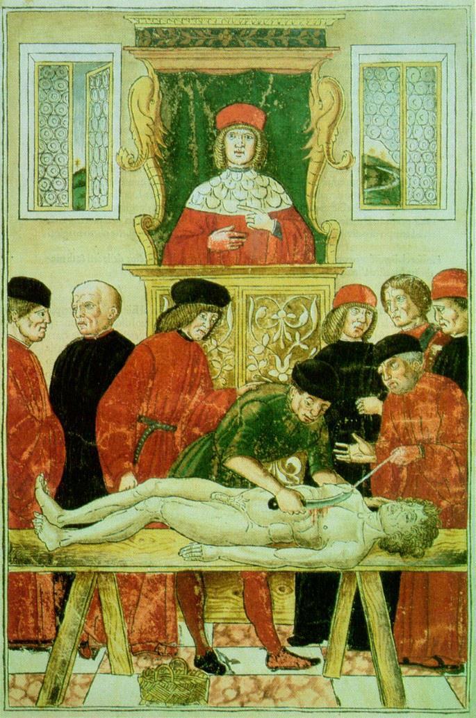 На кафедре - лектор, светило науки. Внизу студенты окружили стол, на котором приглашённый хирург анатомирует труп. Событие очень редкое для школяров. Лишь раз в год, зимой, можно было такое увидеть. Церковь не позволяла резать покойников - надеялись ведь на будущее воскресение из мёртвых, кому понравится воскреснуть с дырявым животом? Но тем не менее и не запрещала это делать категорически. Священники не все были мракобесы.