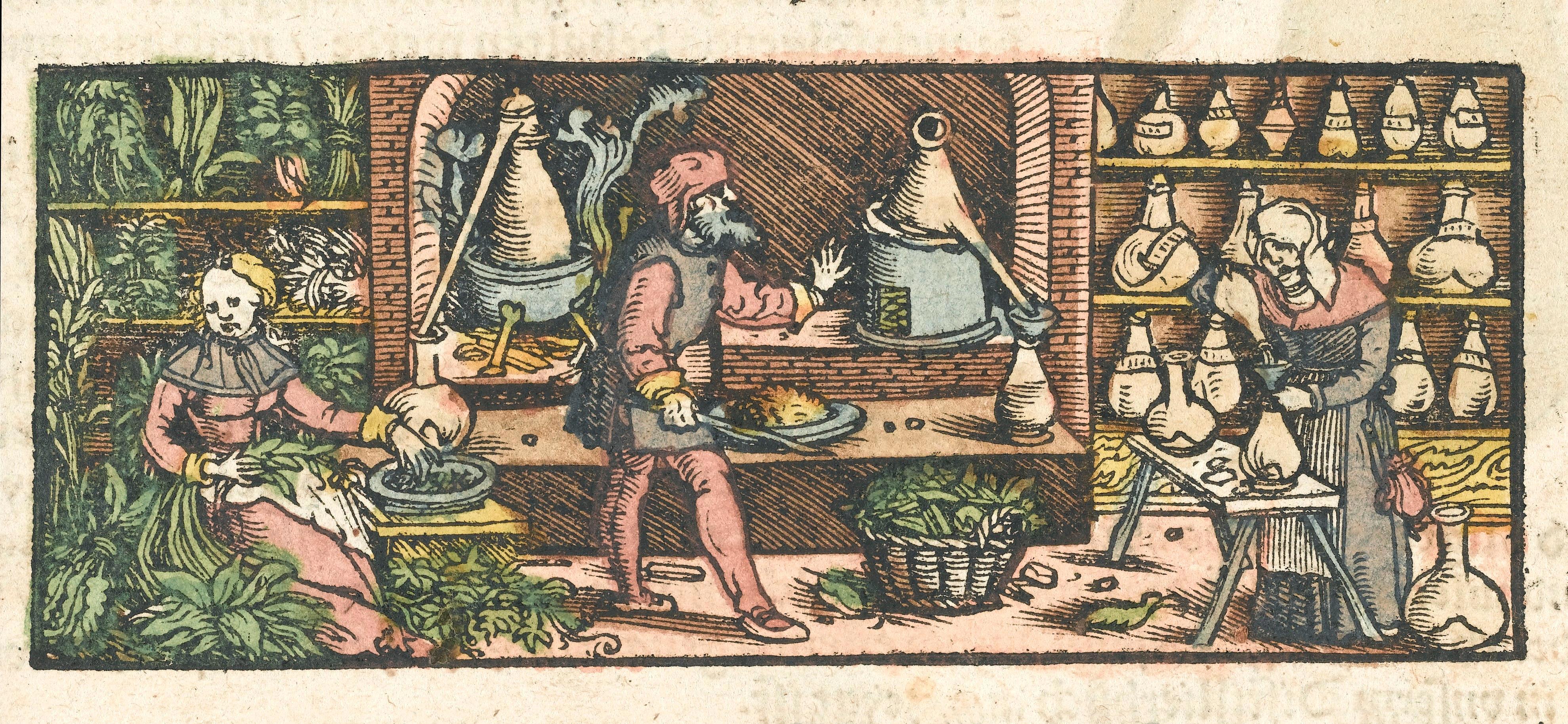 Ещё одна картинка - аптека, или аптечная лавка. В одном помещении и склад для сырья и готовые снадобья в бутылочках и в баночках. В центре аламбик - перегонный аппарат, для изготовления аквавиты. Так, что спирт уже знали в средневековье и активно применяли и наружно и внутрь.