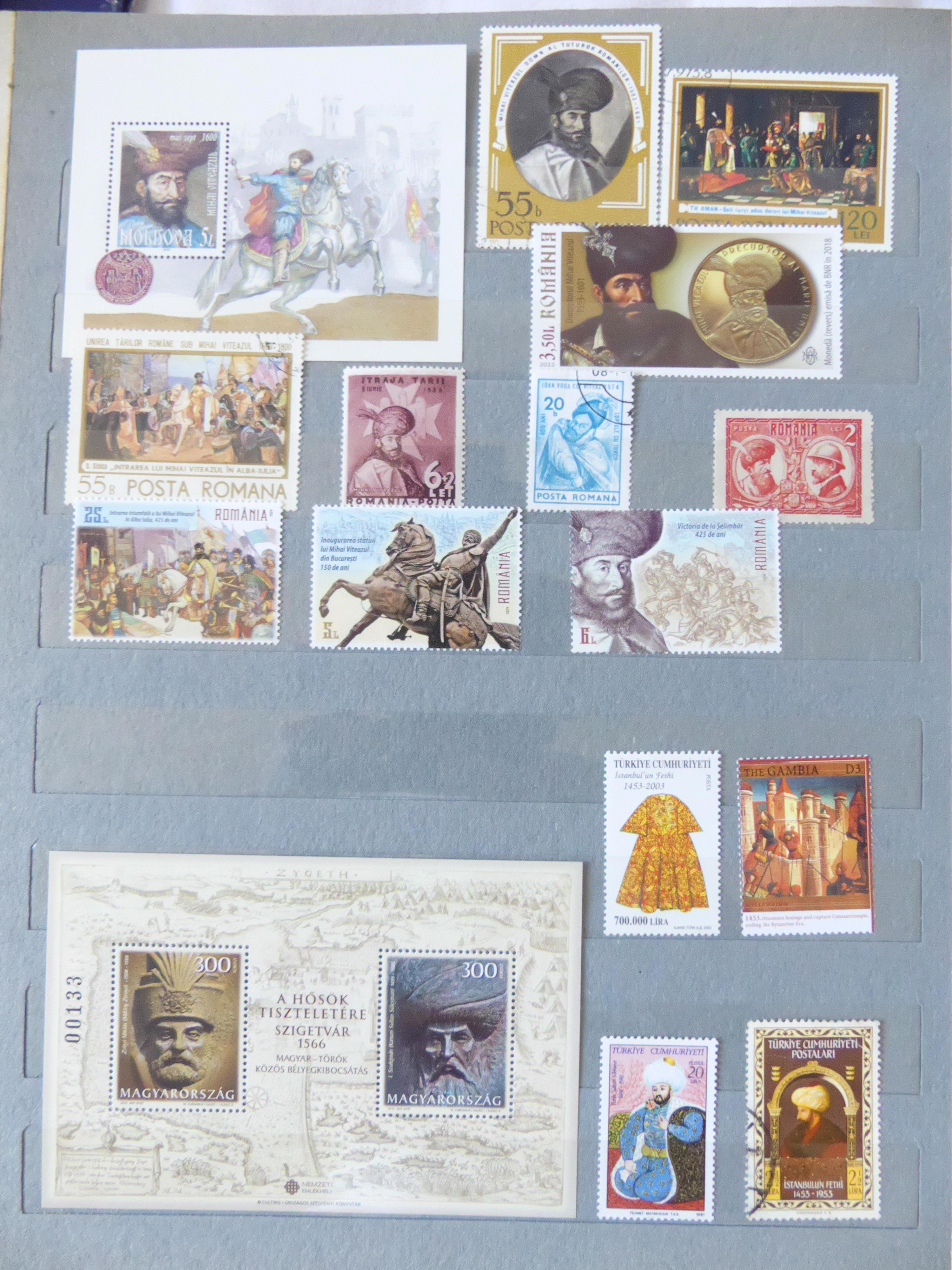 Михай Витязул (про него ничего в повести не будет, но на марках у меня он имеется - как один из героических Дракулешти), Константинополь (со взятия которого начинается "Драконово воинство"), а также главгад повести, с которым все прочие персонажи будут отчаянно сражаться - черный колдун султан Мехмед. До кучи - его правнук, султан Сулейман, про которого в повести, разумеется, ничего нет (он еще не родился), но зато - про этого замечательного гражданина у меня есть отдельные эпизоды в "Мече и Драконе". Бонусом - одеяние султана Мехмеда.