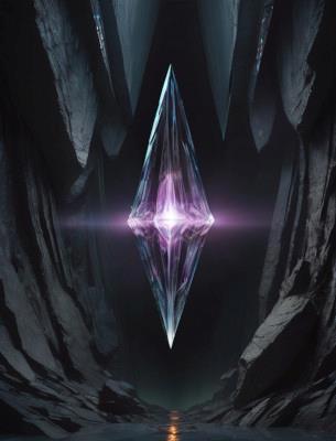Потом настали времена Stable Diffusion 1.0. Появилась первая версия. Я попробовал сделать это более живым. Описав в промте "Таинственный пропорциональный кристалл, светящийся изнутри, энергия, всплески, каменное окружение" и подсунул заготовку. Вот результат:
