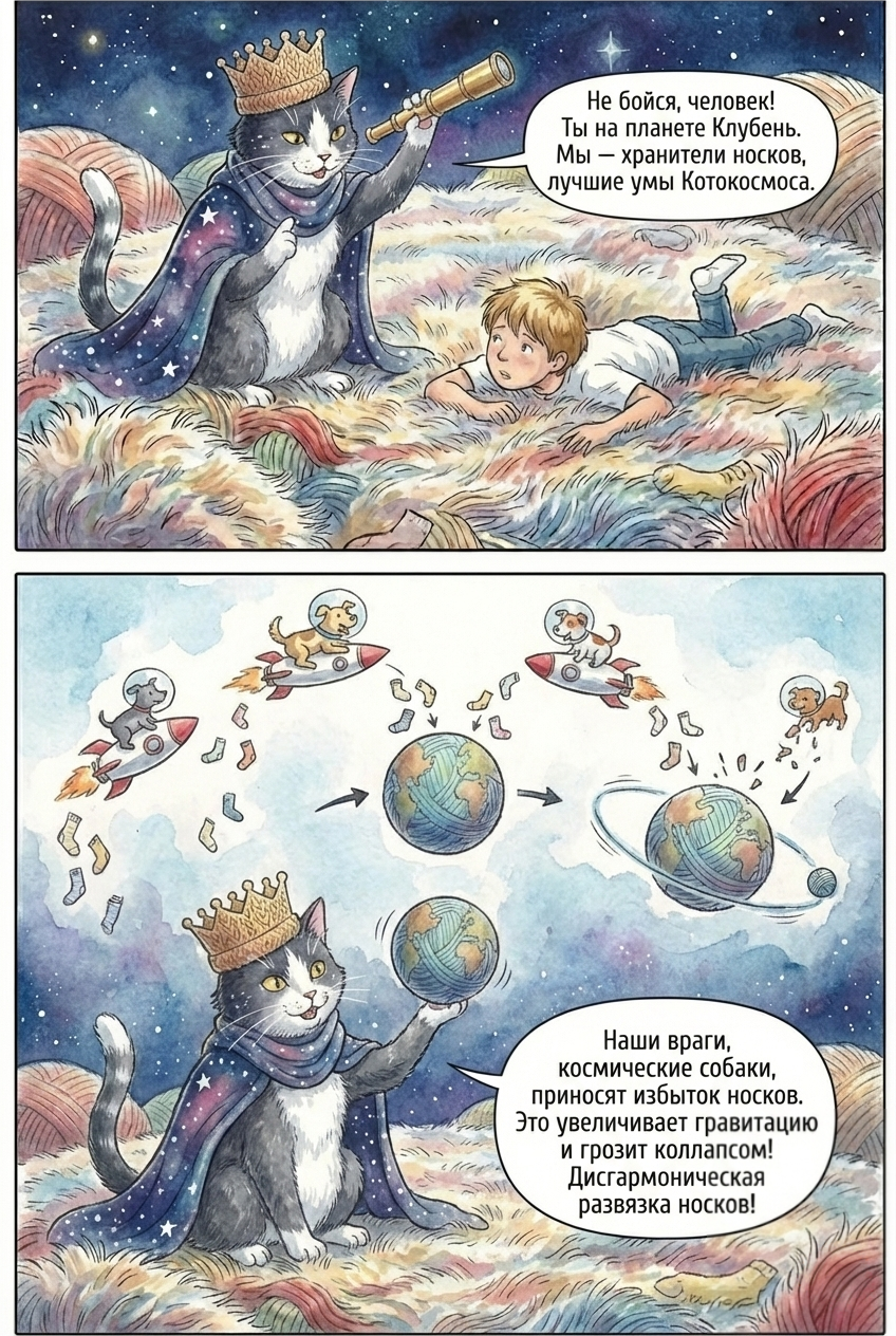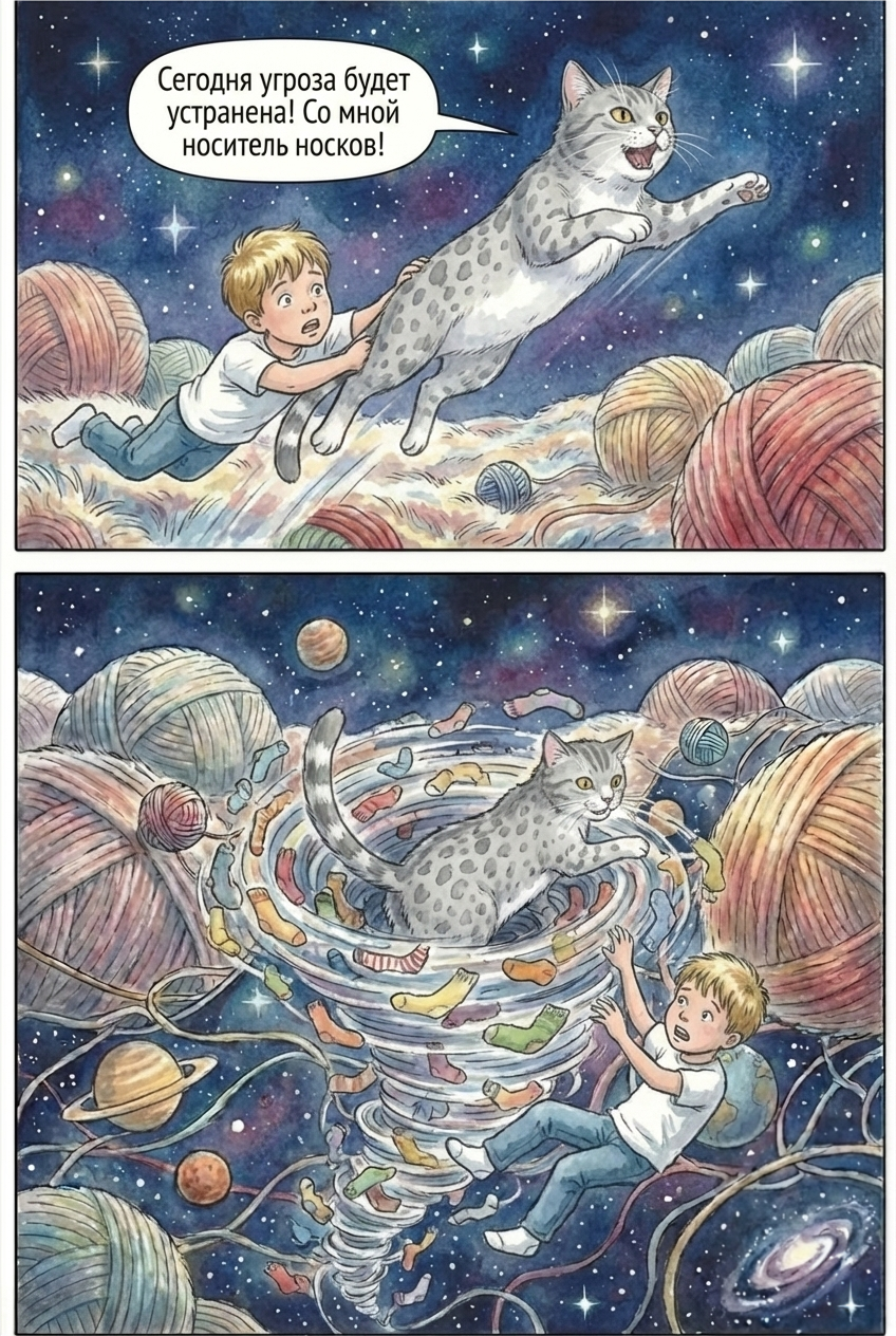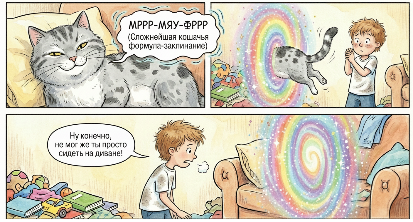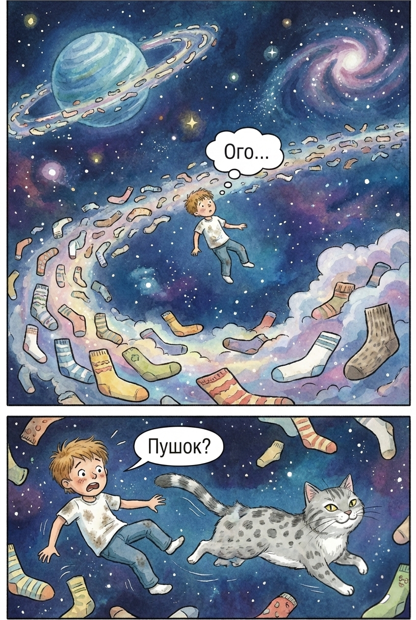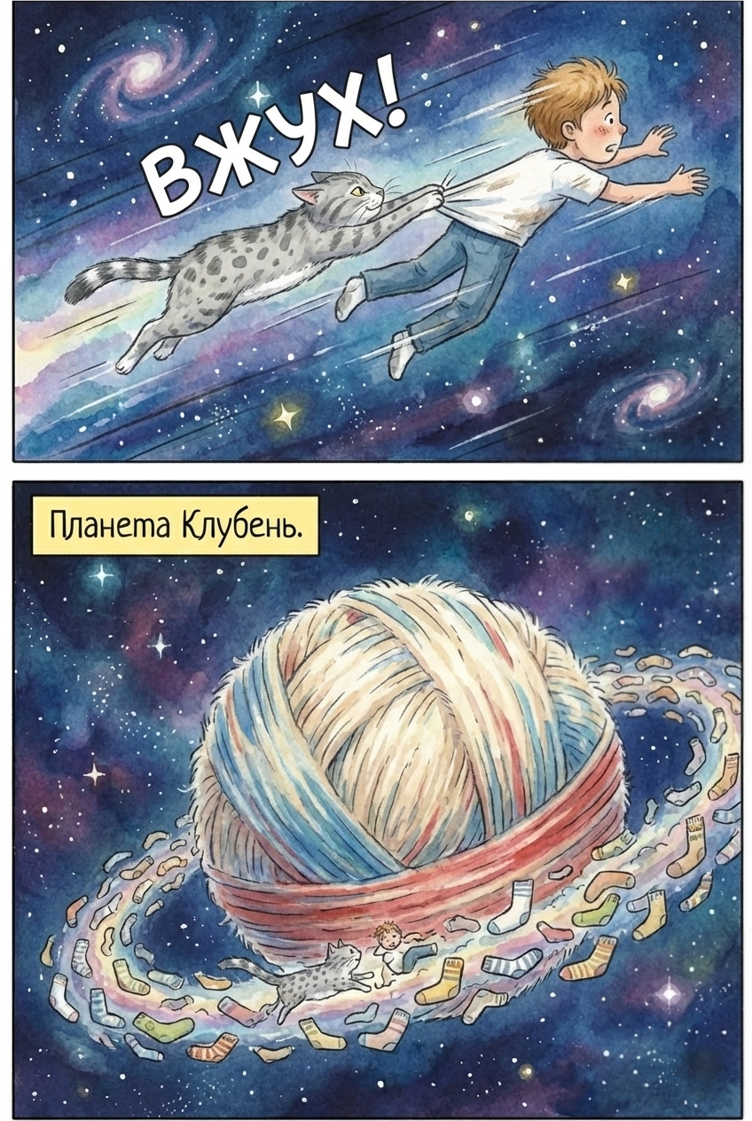 Это веселое и абсурдное путешествие мальчика Васи и космического кота Пушка. Первая история из сборника их приключений.