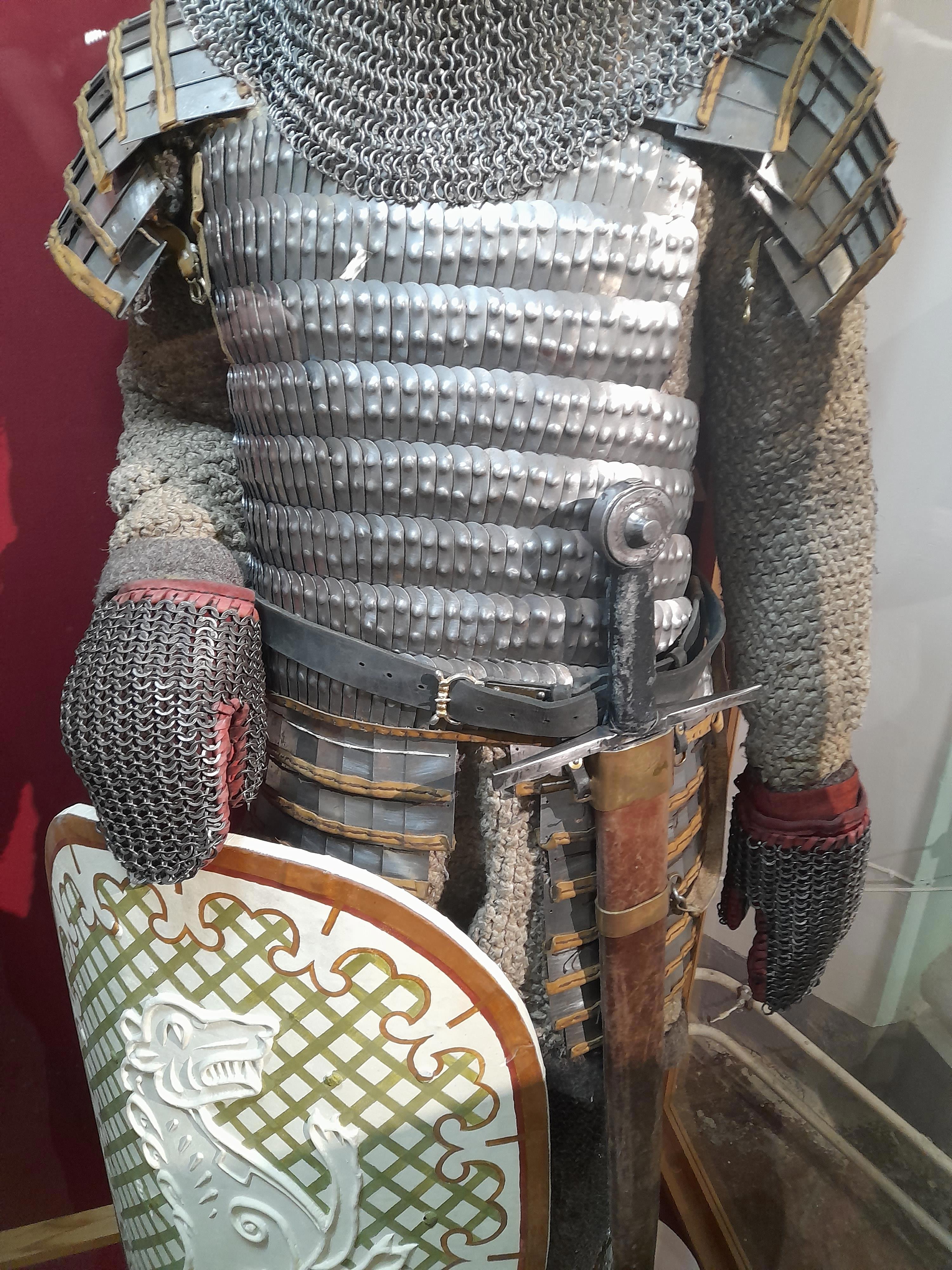 А тут его глазу углядел, что под вполне приличным доспехом - страннонакрученное поддоспешное одеяние - вроде как на манер простого свитера грубого, но из синтетического материала. Не сказать, что такого не могло быть (ну из шерсти понятно или льна) - но археологи похожего не находили, хотя свитера известны издревле. Видно плетение на рукавах и в паху.