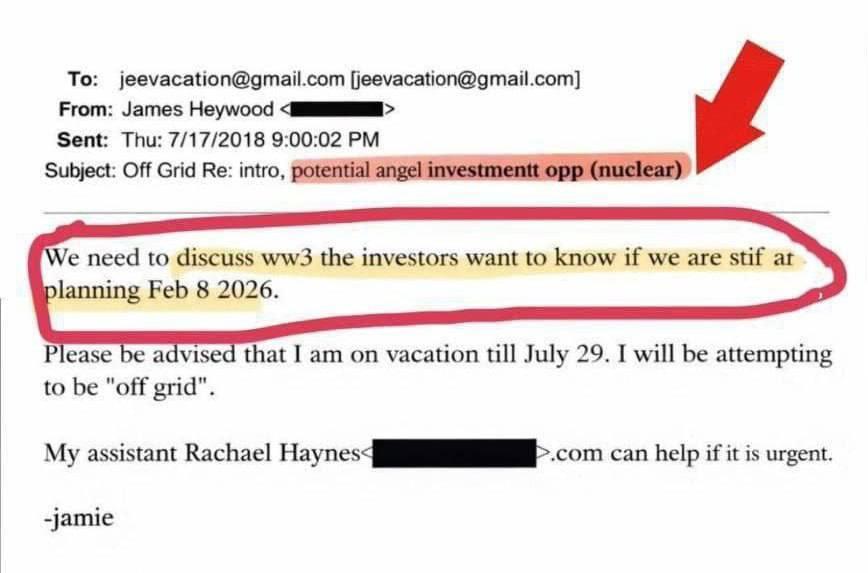 В файлах Эпштейна нашли упоминания о том, что некие инвесторы планируют обсудить возможность начала Третьей мировой войны 8 февраля 2026 года.