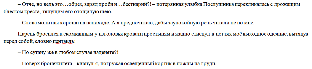 Речь идёт, еБстественно, о новом хер0е моего нового романа «ПасторЪ». Это там, где русреал, мерзопакостная мифологическая нечисть, небольшой городок под нападками оной, и бывший Священник, льющий кровь во имя справедливости. Или не-е-е-е лишь...?!
