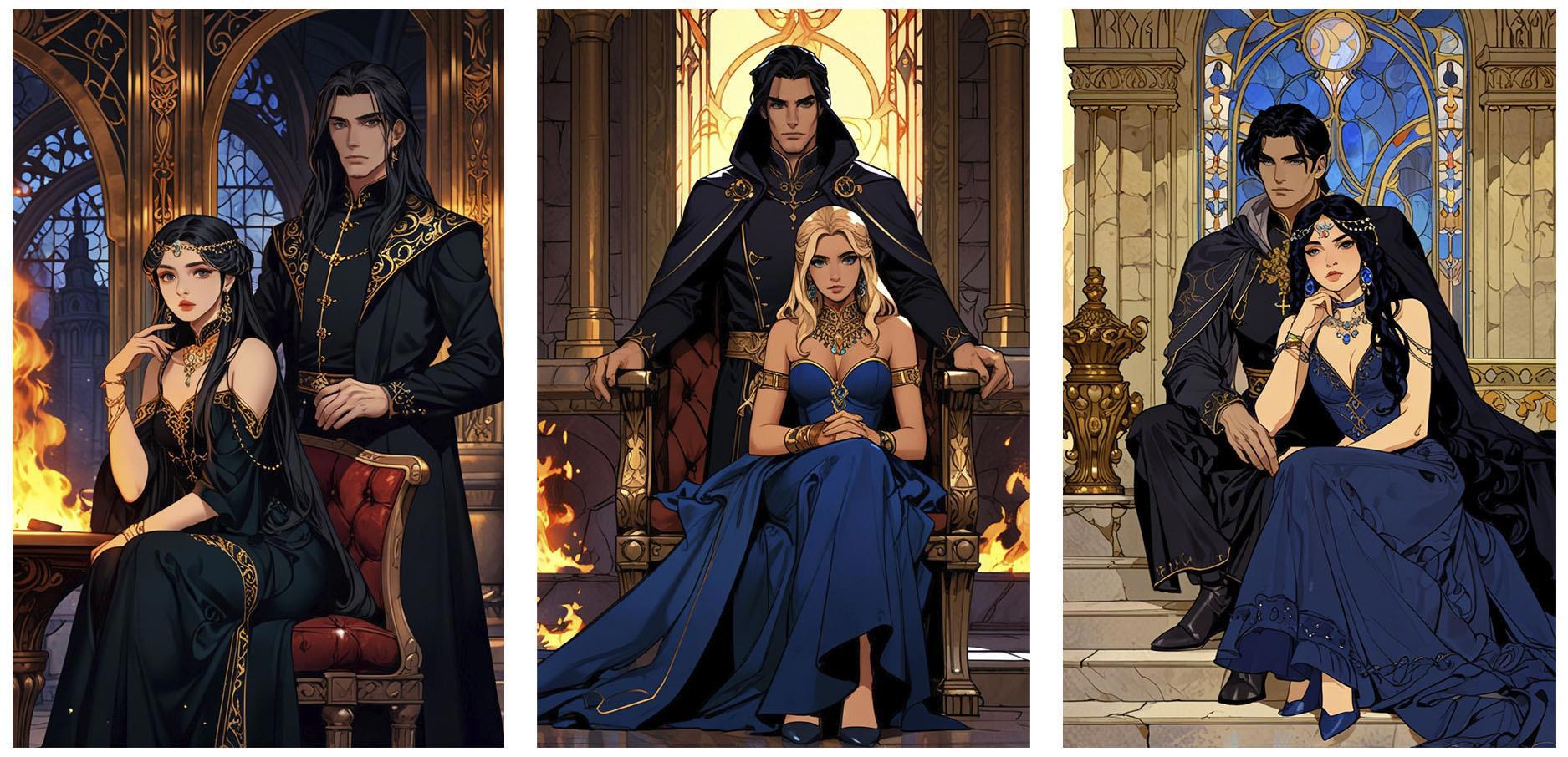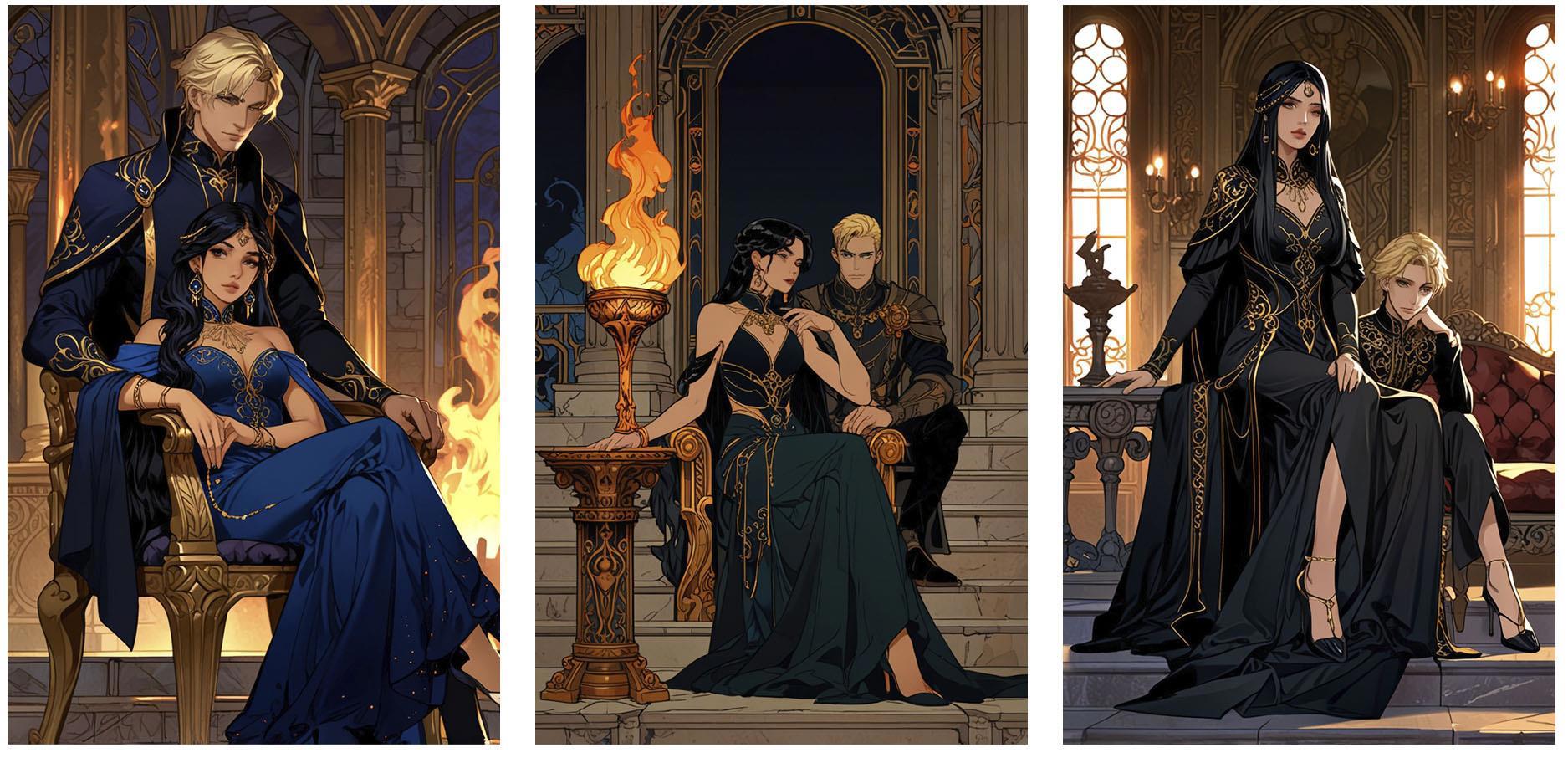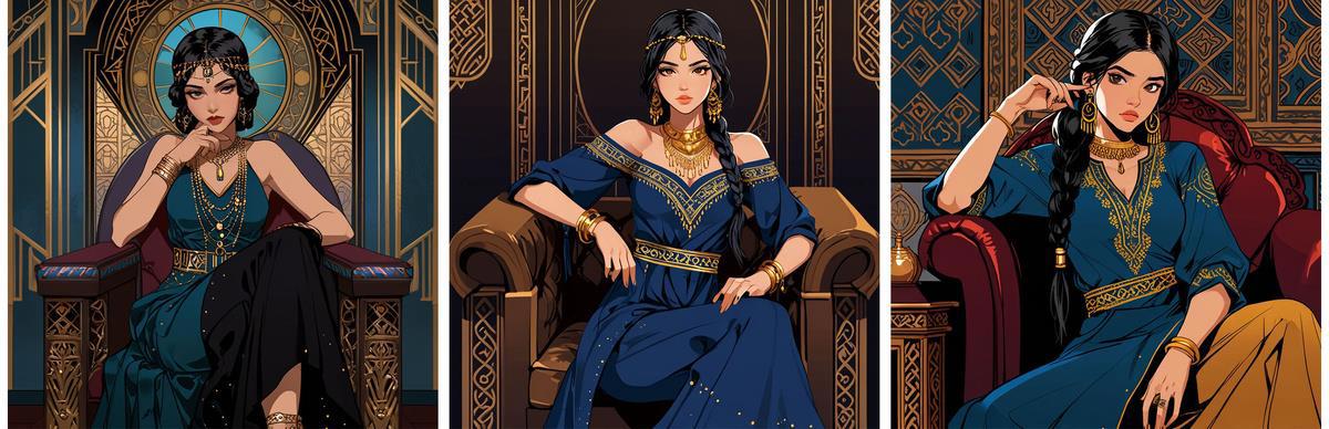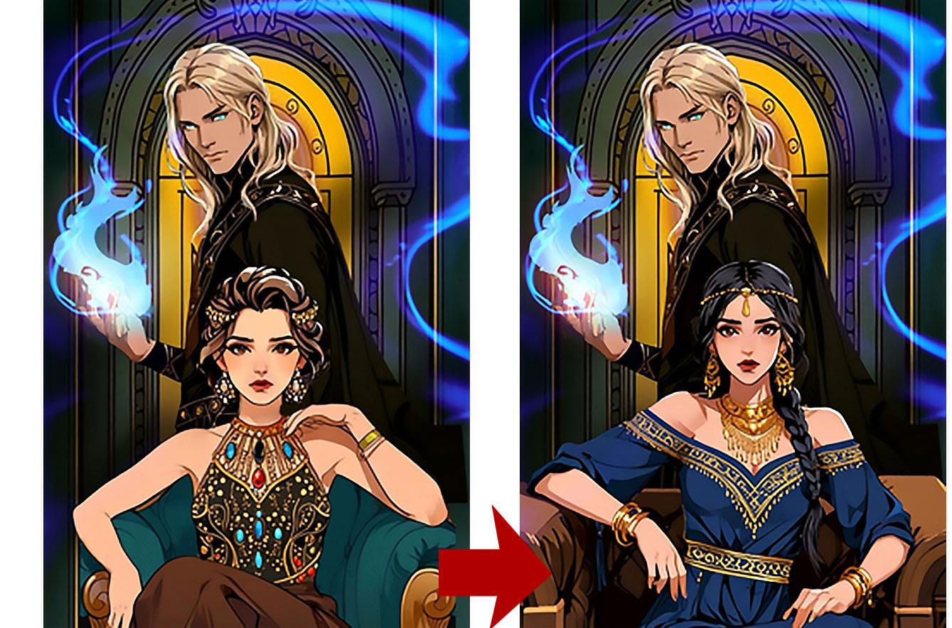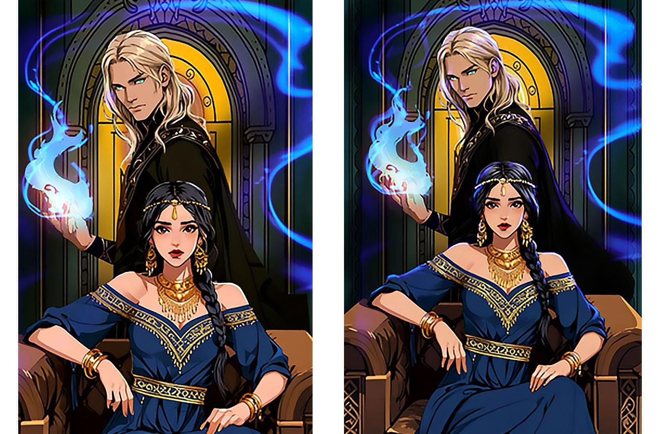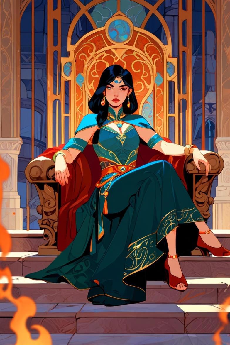 Нейронка продолжает упорствовать в своём личном видении, теперь вообще решив, что героине одной неплохо будет. Пусть сидит себе на троне красивая, и бед не знает.