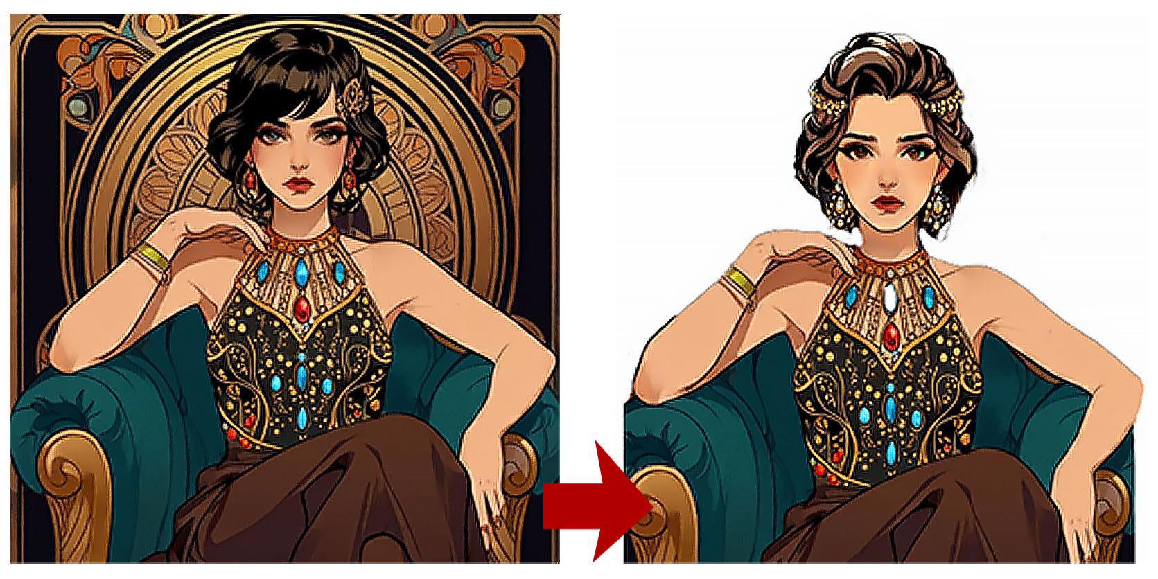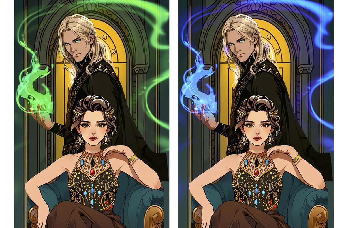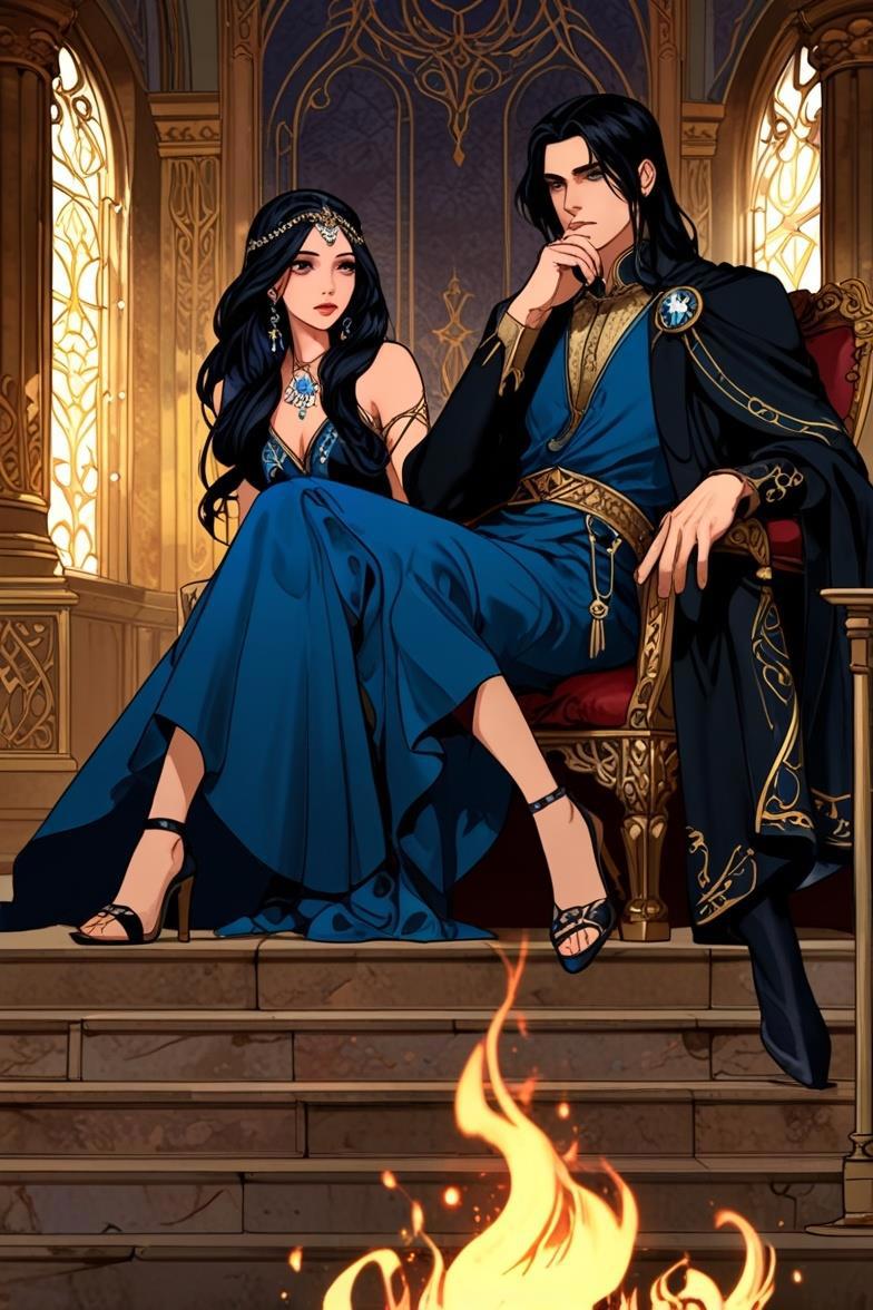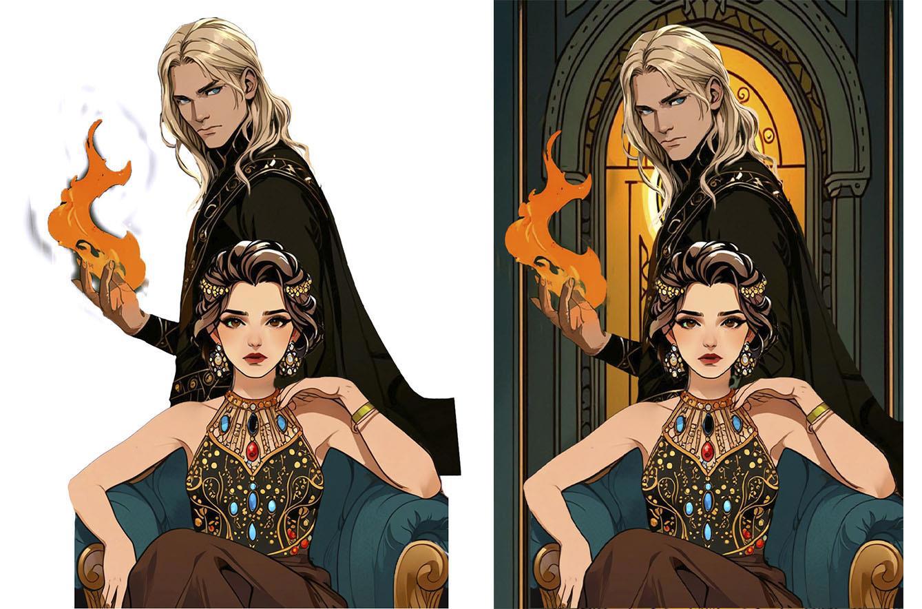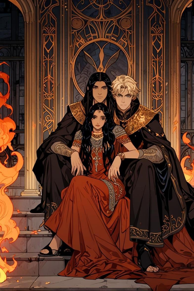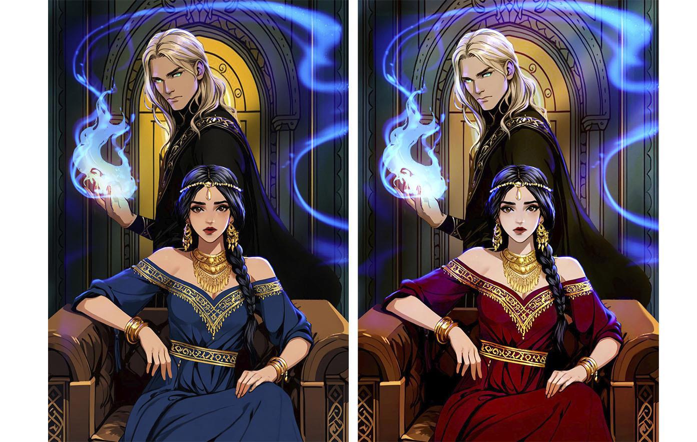Нейронка продолжает упорствовать в своём личном видении, теперь вообще решив, что героине одной неплохо будет. Пусть сидит себе на троне красивая, и бед не знает.