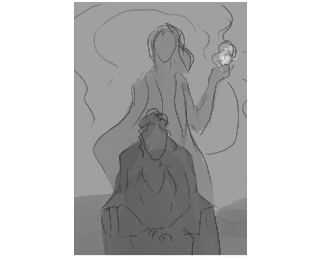 Еще немного доделок - поправила пальцы персонажей, это куда легче, чем рисовать с нуля. Так же убираю мелочи, неровности. Немного меняю композицию, отодвинув персонажей назад и дав им больше пространства.
