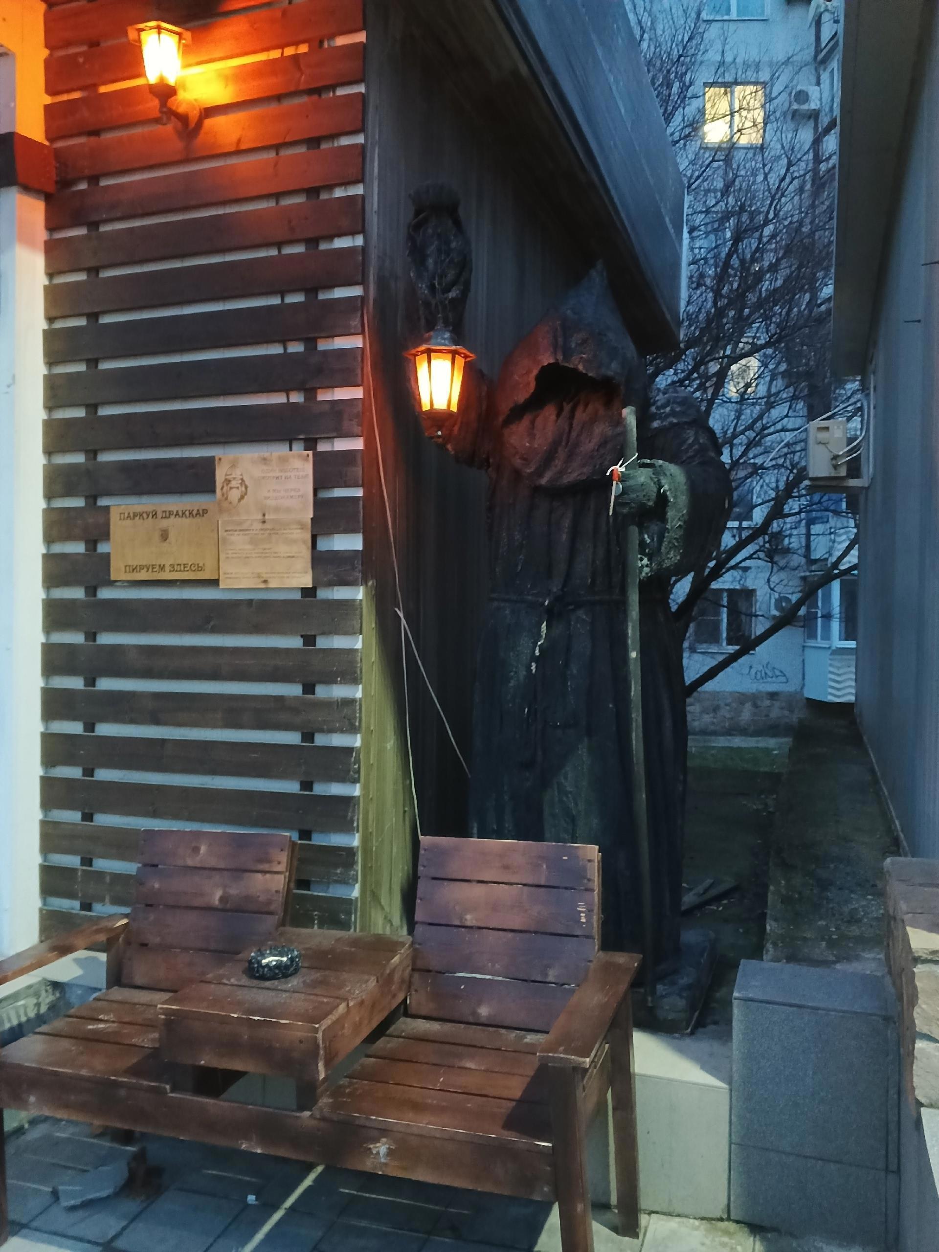 Наконец мы вышли из частной застройки к панельным домам. Если откинуть состояние жилого фонда, то почти сразу мы увидели вот такую картину. В общем, нас встречал не то назгул, не то "типичный монах". А оказалось, что всё гораздо проще. Это известное не только в Новороссийске место. Это та самая "Буйная фляга". Да, об этом баре мы слышали от ролевиков уже довольно давно. И вот, сподобились. Внутрь не заходили, извините.