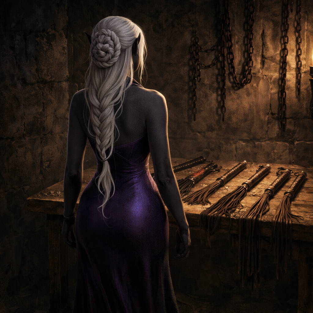 Жрица остановилась у стола с ровно разложенными плётками и кнутами. С короткими кожаными хвостами, с длинными и тяжёлыми, с узлами на концах, с металлическими вставками. У некоторых кожа блестящая, у других — выцветшая и потёртая от времени и частого использования.