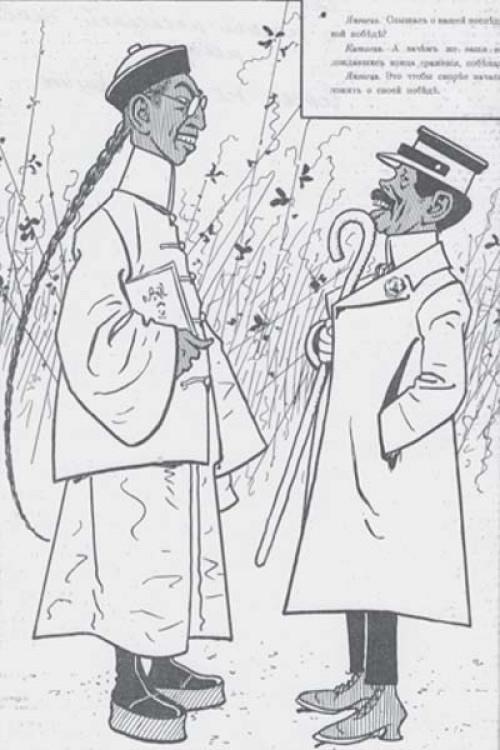 Так, журнал «Стрекоза» на протяжение всех военных месяцев публикует «диалог с продолжением» – серию карикатур, на которых два персонажа – китаец и японец – обсуждают злобу дня. При этом хитрый, спокойный китаец то подначивает хвастливого японца, выставляя его полным глупцом, то пытается его вразумить, то просвещает по части поведения западных держав и того, чего от них можно ждать азиатам...