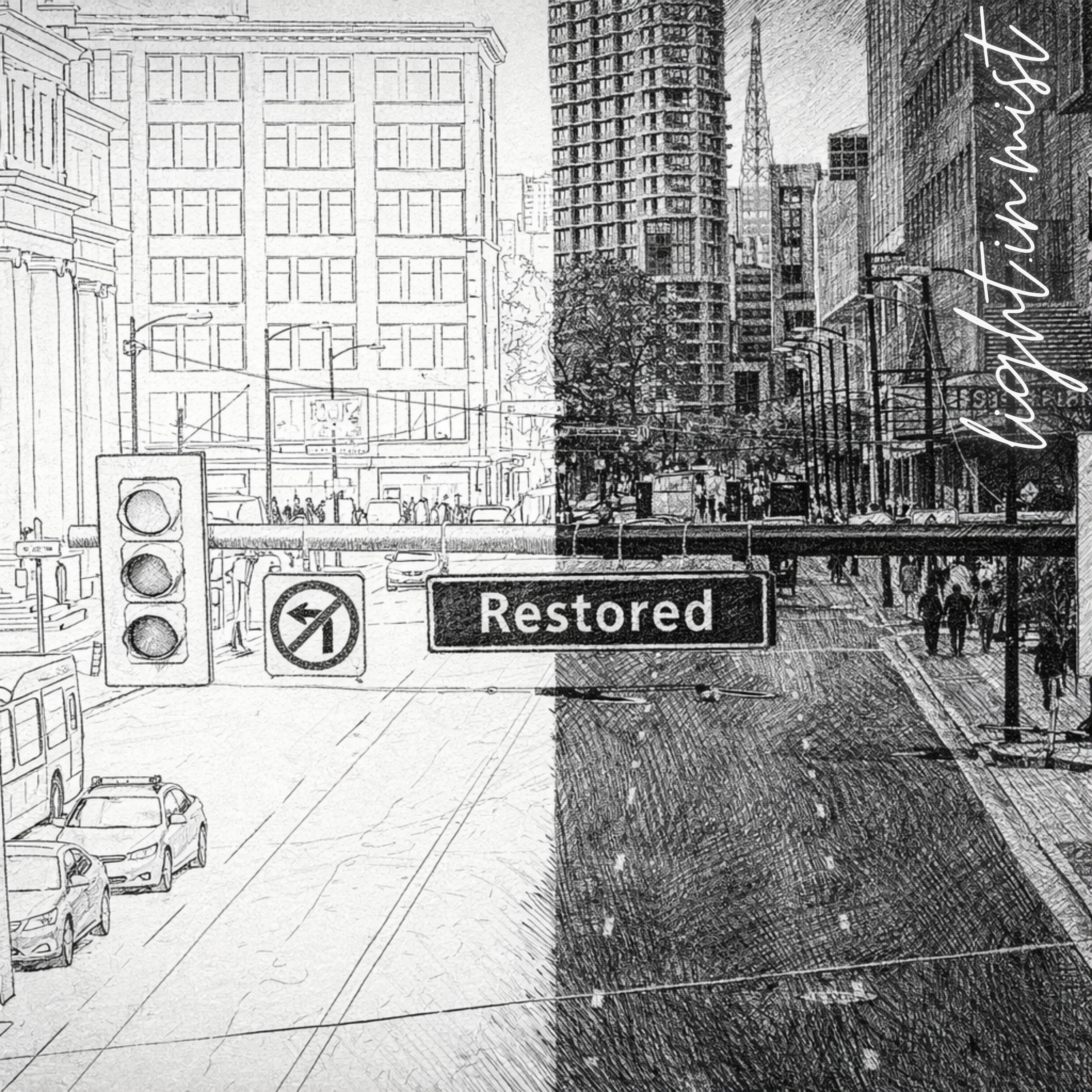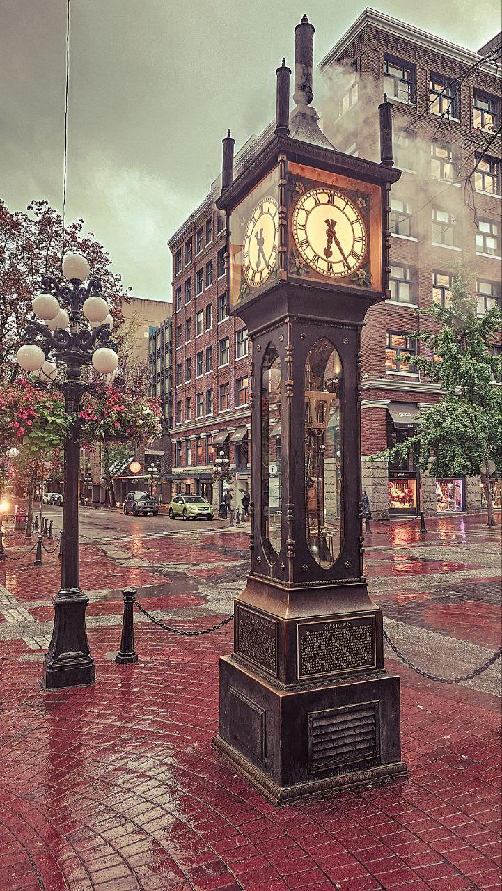 Посыл, в целом, прямолинеен: половина картинки набросок, половина - доведённая до ума. Это буквальная иллюстрация концепции и истории создания "Restored". Но тут есть ещё один небольшой внутренний слой. Дело в том, что, гуляя по тому же Ванкуверу, я как-то сфотографировал знаменитые паровые часы.