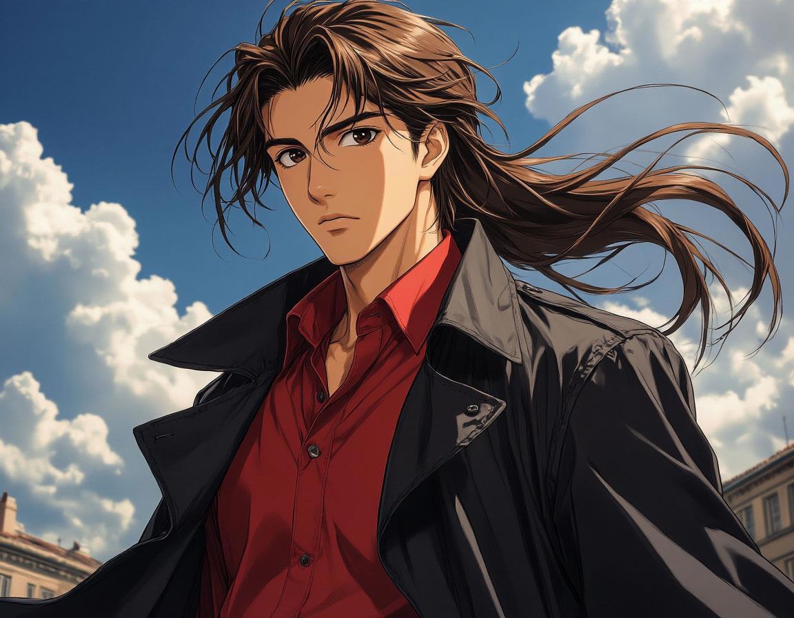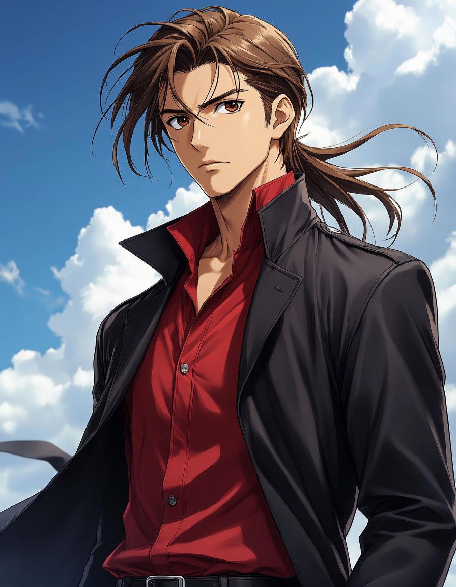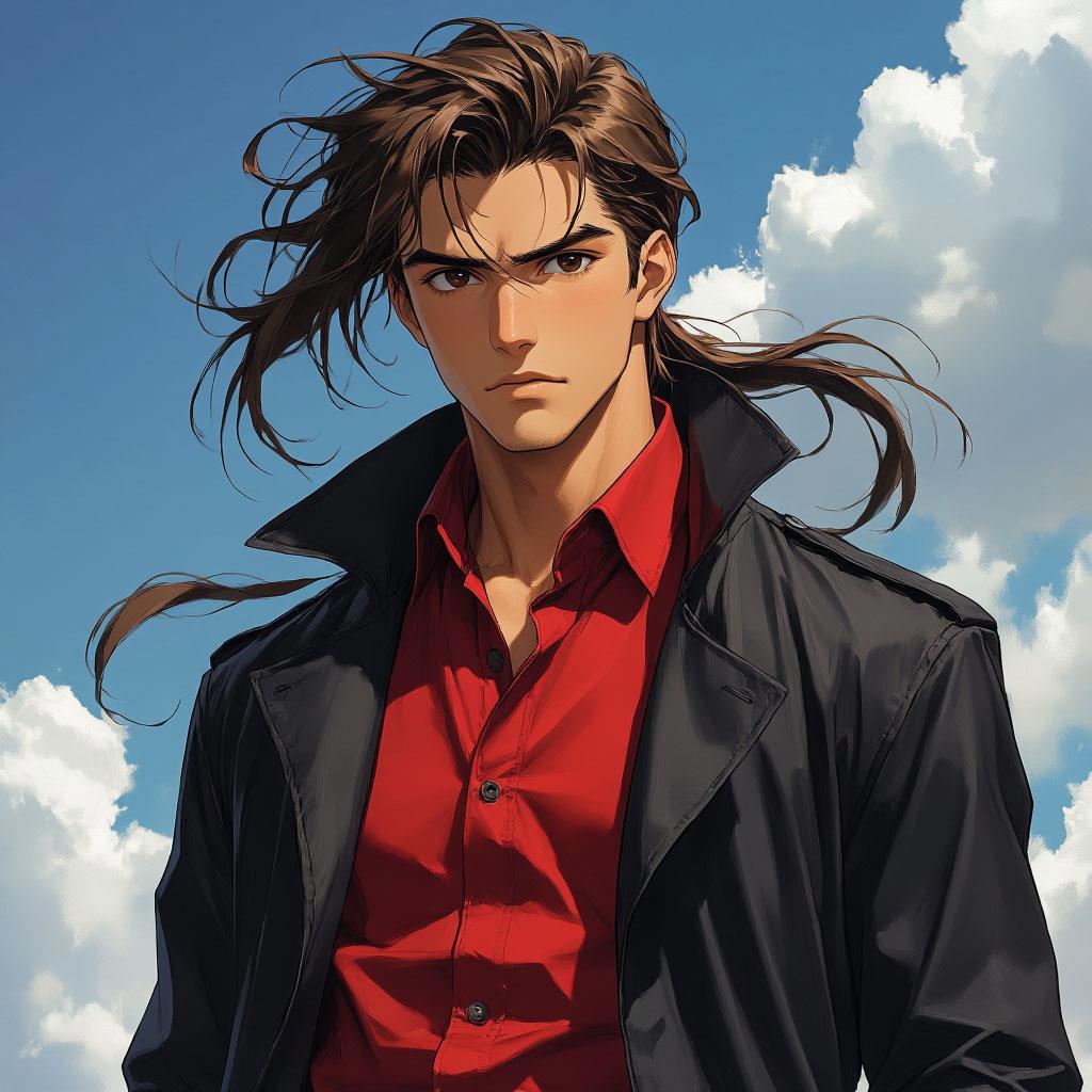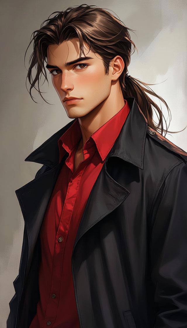 носит красную рубашку и черный плащ. карие глаза, высокий парень двадцати двух лет, каштановые волосы собраны в длинный хвост, классические черты лица, ветреный, легкомысленный