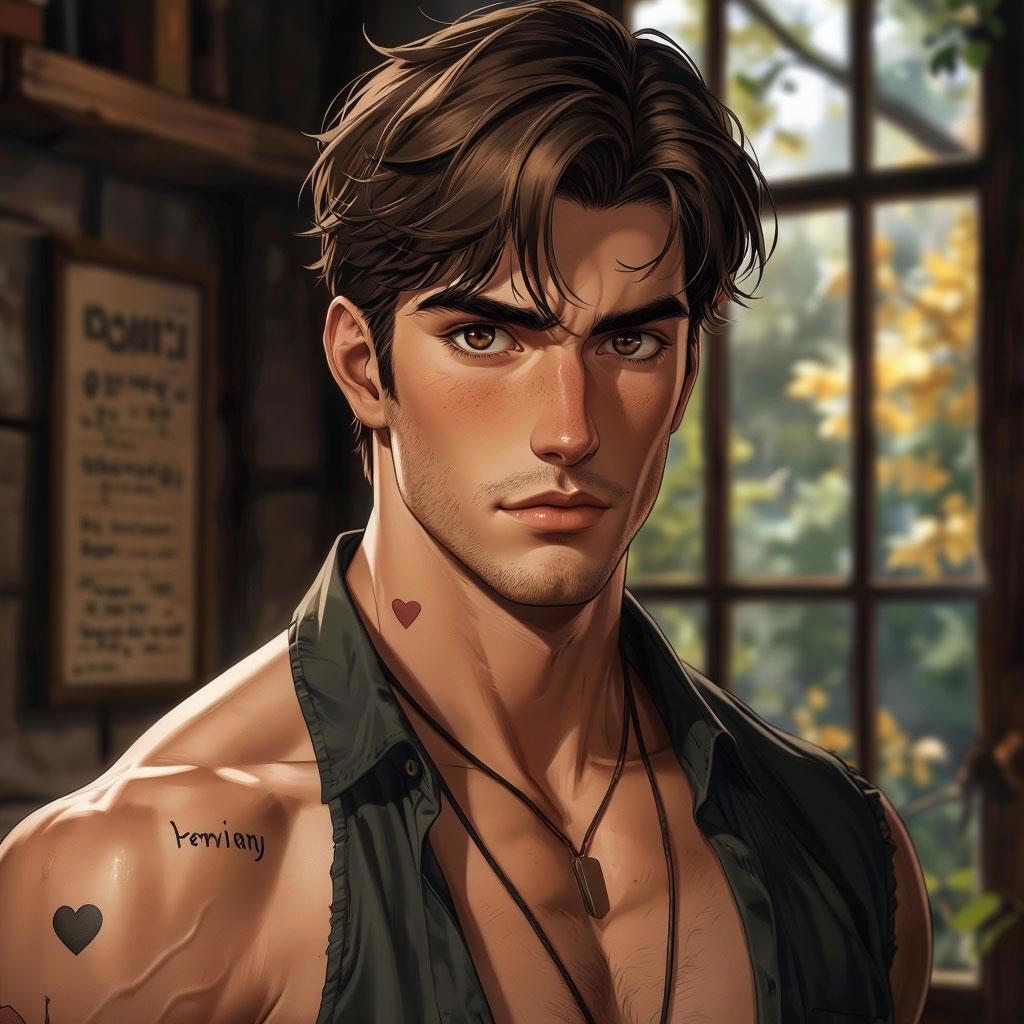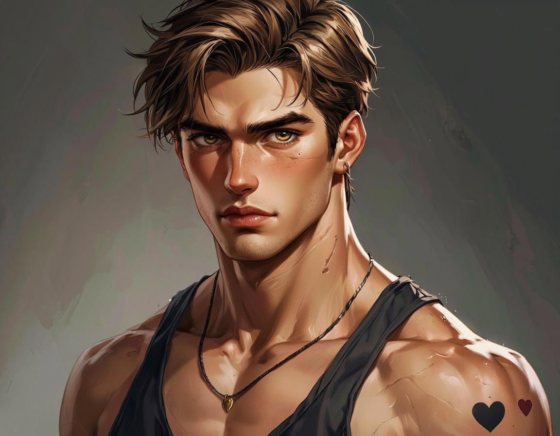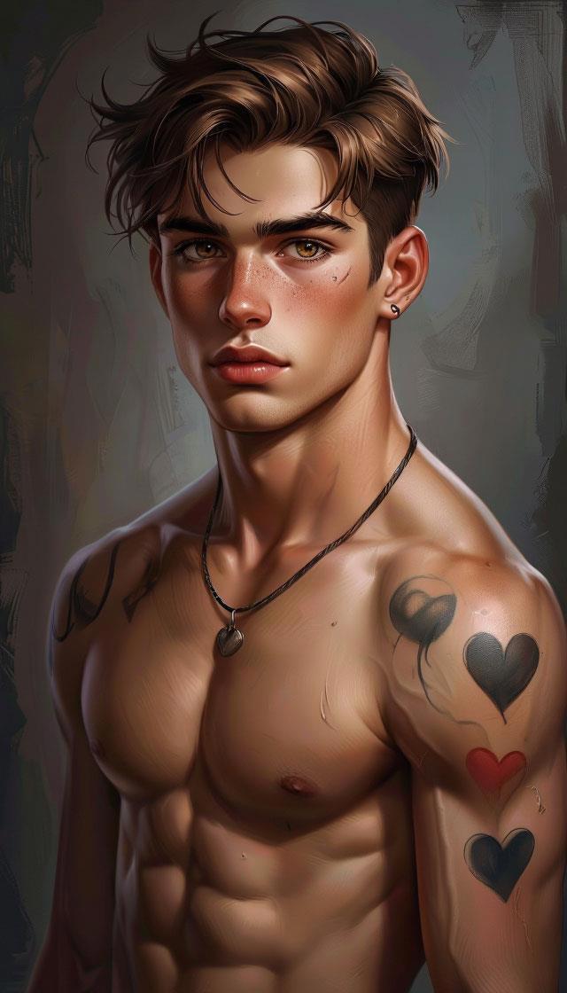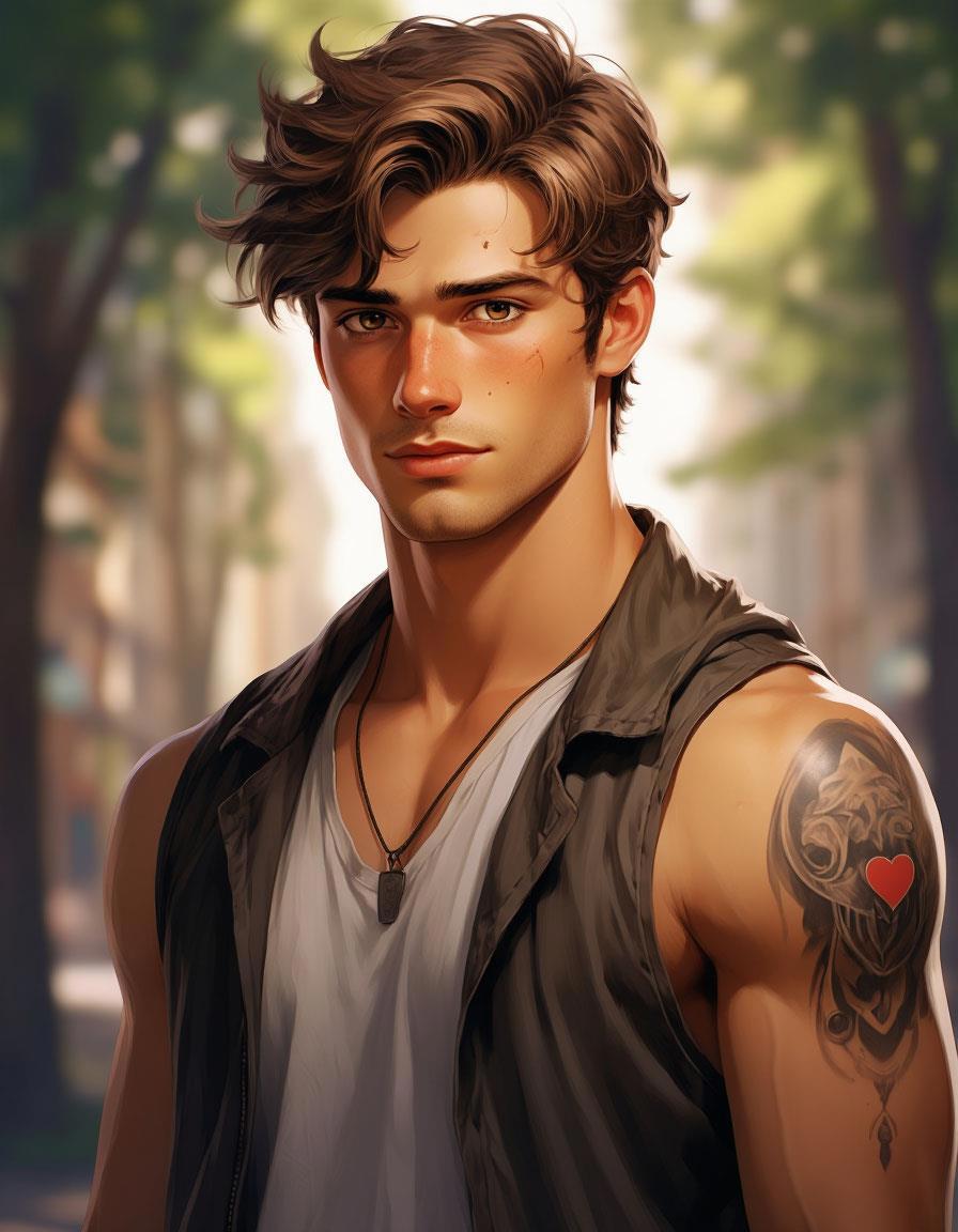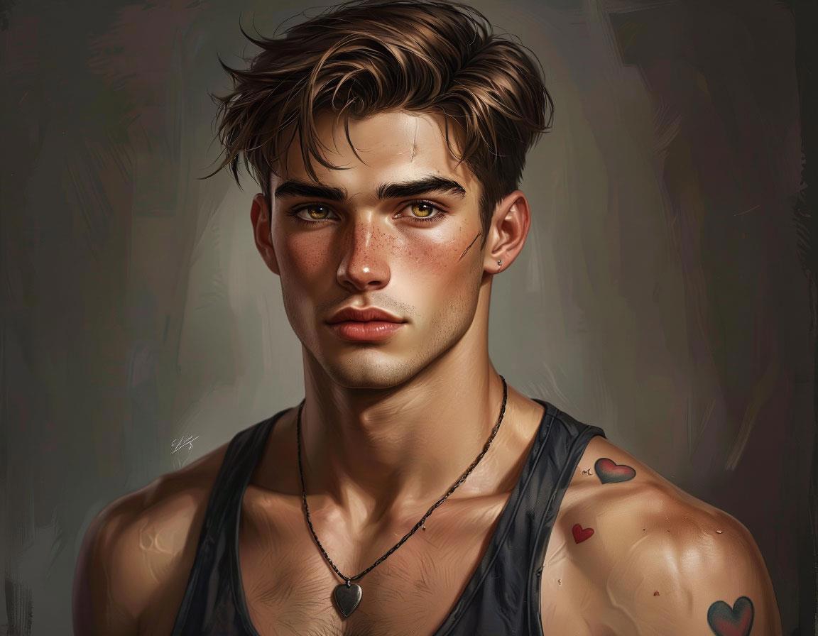 Рост 1.79 м, глаза темно-оливковые. Цвет волос: каштановый, на левом плече тату в виде маленького сердца. Высокий молодой мужчина, привлекателен для женщин.