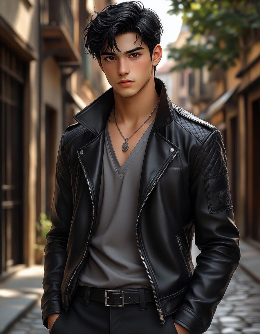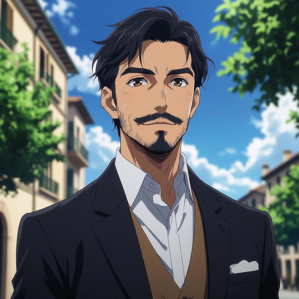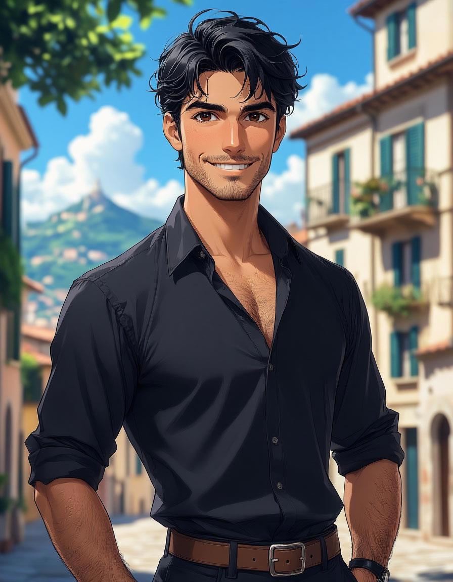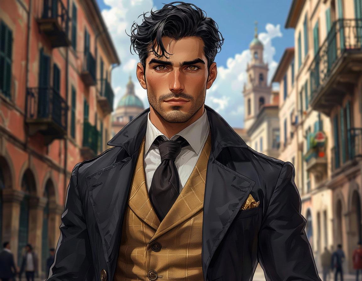 Рост 1.75 м, непосредственный, живой, высокий молодой мужчина-итальянец, возраст - тридцать три года, черноглазый, черноволосый, черноусый, смуглый, говорливый
