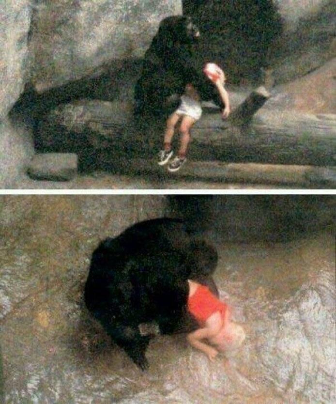 Пока люди в панике наблюдали за происходящим, 8-летняя самка гориллы по кличке Бинти Джуа подошла к ребёнку, осторожно подняла его на руки и прижала к себе — так, как она держала собственных детёнышей. Затем она перенесла мальчика к служебному выходу и спокойно ждала, пока сотрудники зоопарка смогут его забрать.