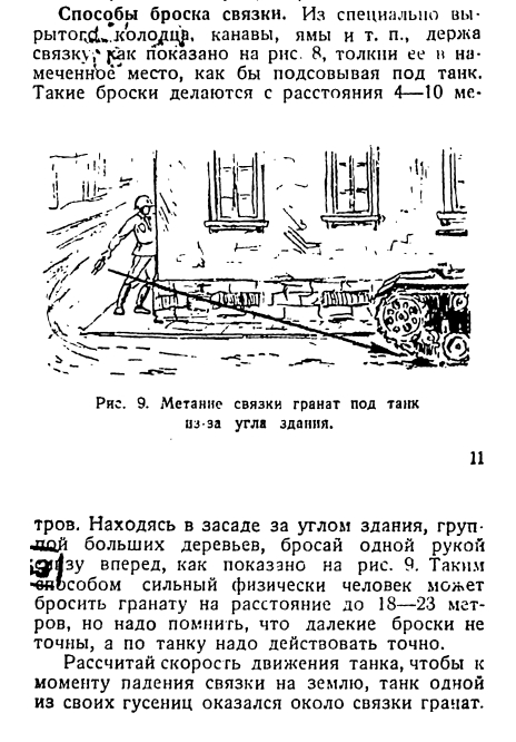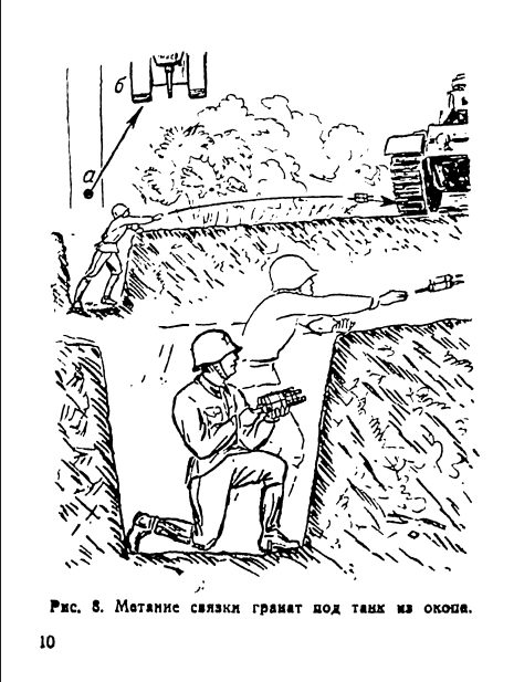 “Способ действия отряда: приблизиться к танку пр-ка при поддержке всех видов оружия или подползти к нему… вскочить на танк ( с противоположной стороны), положить связку гранат позади башни, поджечь и прыгнуть в укрытие. Действие – экипаж танка уничтожается или тотчас же покидает танк…”