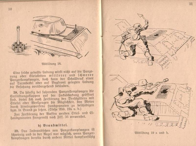 Подпись под изображением гласит, насколько хватает моего знания языка и понимания готического шрифта, что cвязка гранат не метается в броню и ходовую часть. Впрочем, есть оговорка, что это касается средних и тяжёлых танков (в другом источнике её, правда, нет).