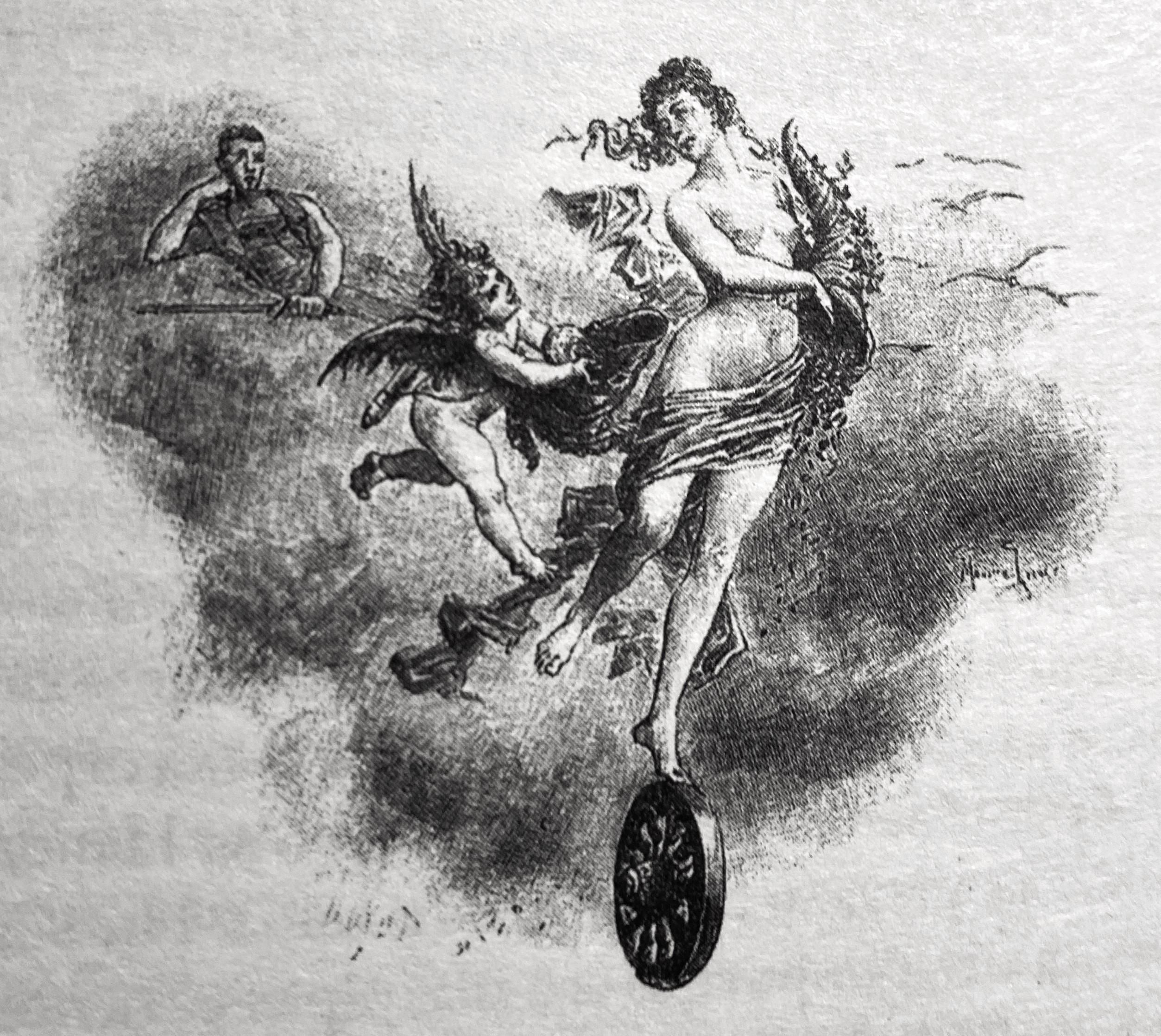 Мушкетер на коне, который делает каприоль. Между прочим, каприоль (это когда конь прыгает по оленьи) -- это одна из самых сложных фигур выездки, а вот в XVII веке она имела практическое значение, в бою.