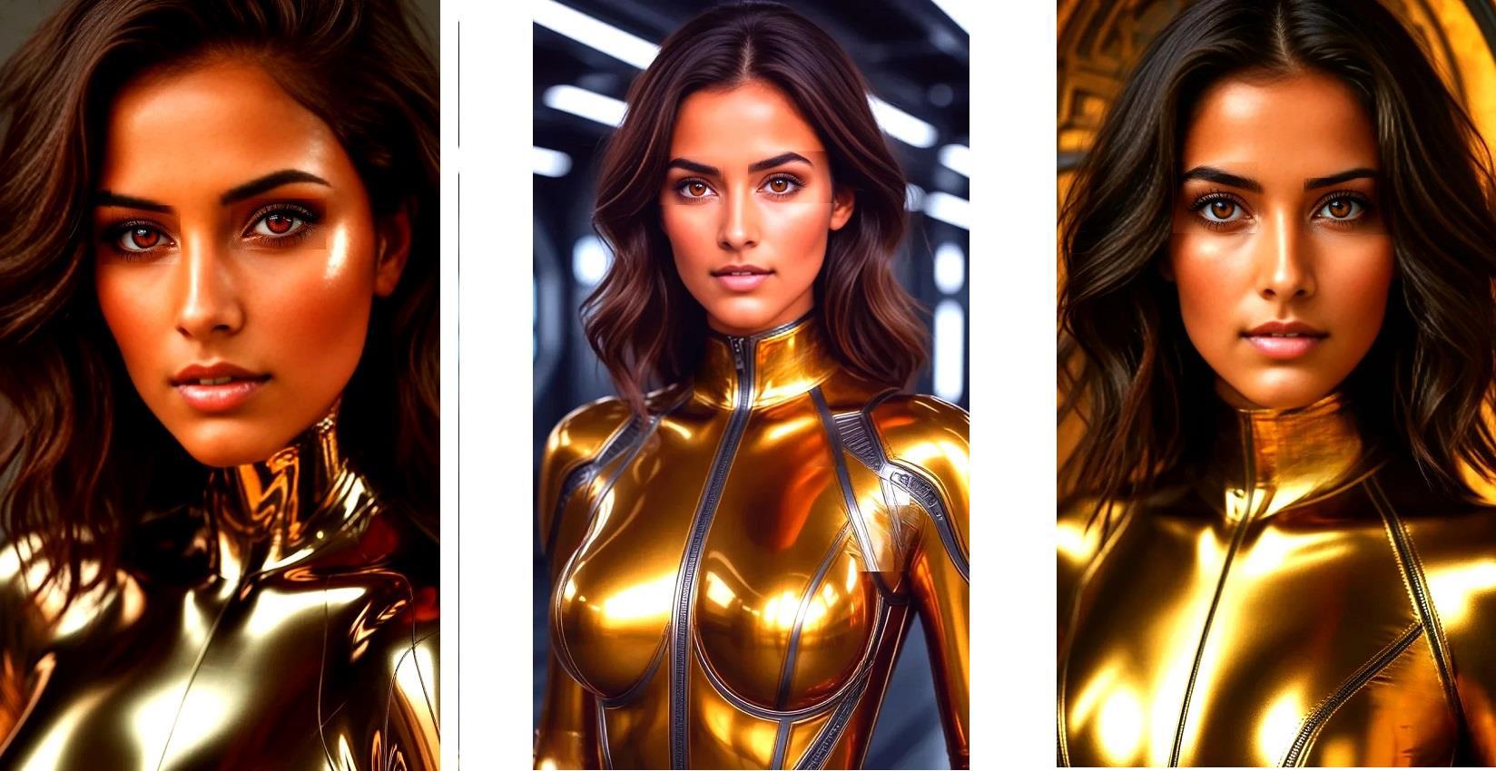 Но, я не стал бы выкладывать пост, если бы так не получил результата. А как известно, если долго мучиться …. Главное, не прекращать поиски. В Шедевруме мне таки встретился портрет восточной красавицы с карими глазами, который подходил под мои запредельные требования. Я стибрил у автора промт, прокачал его и получил результат, который меня наконец-то удовлетворил. Красавицу с характерным лицом, которое сохранялось при обработке. По ходу дела пришлось решить вопрос о цвете её скафандра. Иван Антонович Ефремов не удосужился его придумать, хотя по ходу книги она его надевает. А по Канону у каждого звездонавта из экипажа «Тёмного пламени» скафандр имел свой индивидуальный цвет, который в какой-то степени отражал характер владельца и выделял его из остальных. Я своей волей писателя-демиурга подарил ей скафандр золотого цвета, параллельно придав, в соответствии цвету, всегдашнее добродушное настроение. Итак, образ получен. Остаётся размножить его на разных иллюстрациях.