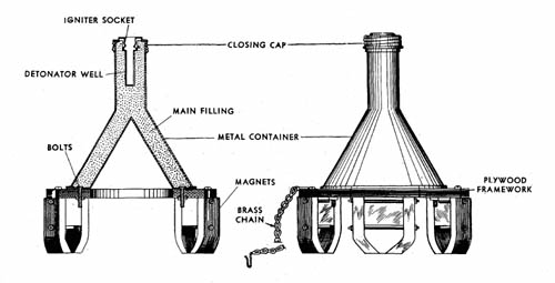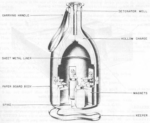 Но эта штука оказалась слишком сложной и дорогой в производстве, поэтому её заменили на Hafthohlladung 3 (Где две предыдущих? Спросите у старичков в Аргентине, хз.) Там корпус уже был сделан из шести, да и формой был попроще. Тут бронепробиваемость увеличилась до 140 миллиметров, а масса ВВ - до полутора кило. В таком варианте эта штука выпускалась до середины 43-его, когда появилась мина Hafthohlladung 5 (Где четвёртая? Нувыпоняли.), с увеличившейся до 3,5 кг массой (1,7 кг ВВ) и пробитием в 150 мм. Где можно было в 43-ем найти танк, имеющий толщину брони корпуса выше 140 мм хоть где-нибудь, и зачем было модернизировать мины в этом направлении - неясно, зато теперь немецким сапёрам пришлось таскать лишние полкило, а потом от них же (в виде осколков) бегать. Благо, в это же время к магнитным минам начали штатно поставлять взрыватели на 7,5 секунд.